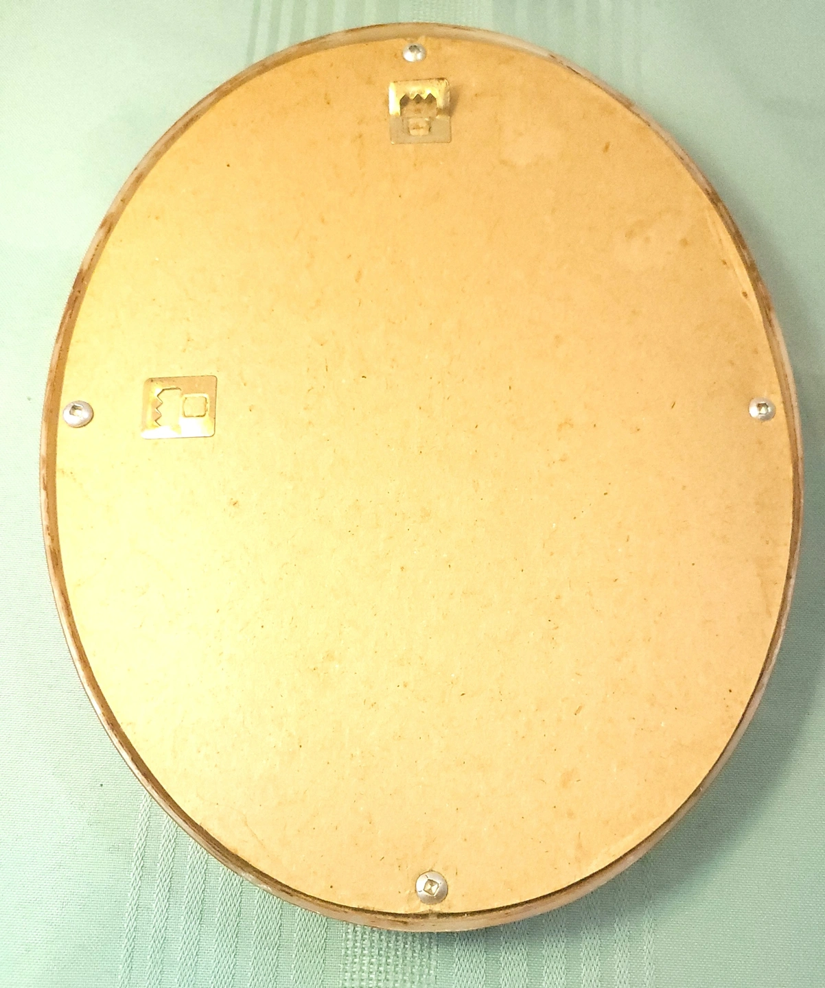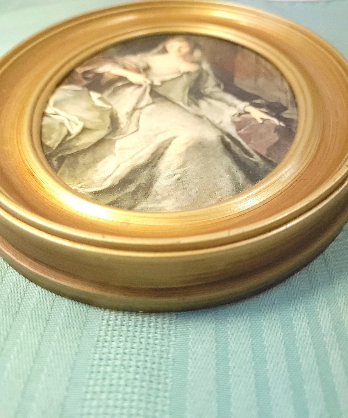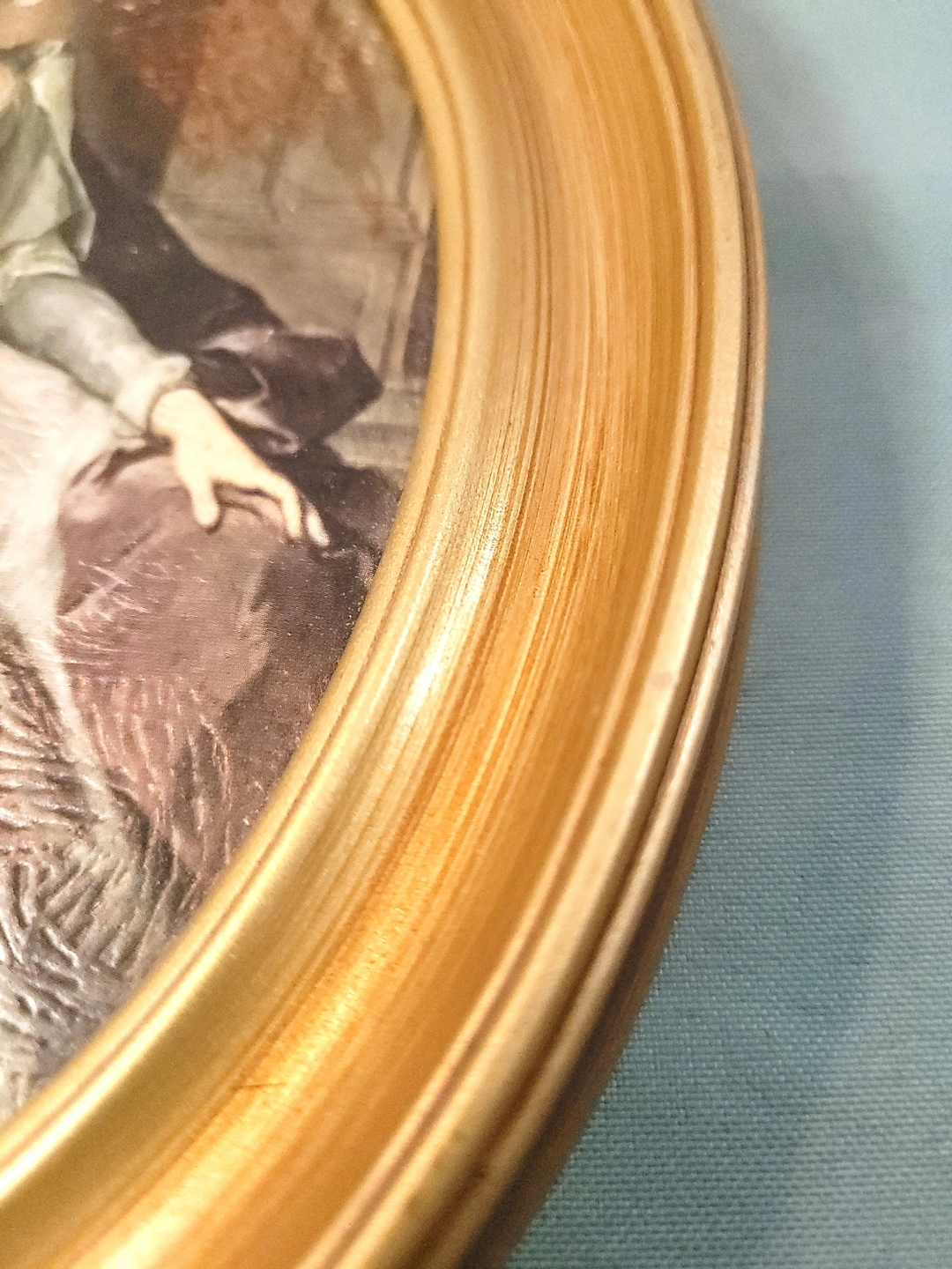 This item is in good vintage condition with light wear. As seen in the provided photos, there is light wear on the back of the piece, including some scuffing to the hardboard backing which is typical for a decorative item of this age. The front-facing gold frame and the portrait print remain in excellent, vibrant condition.