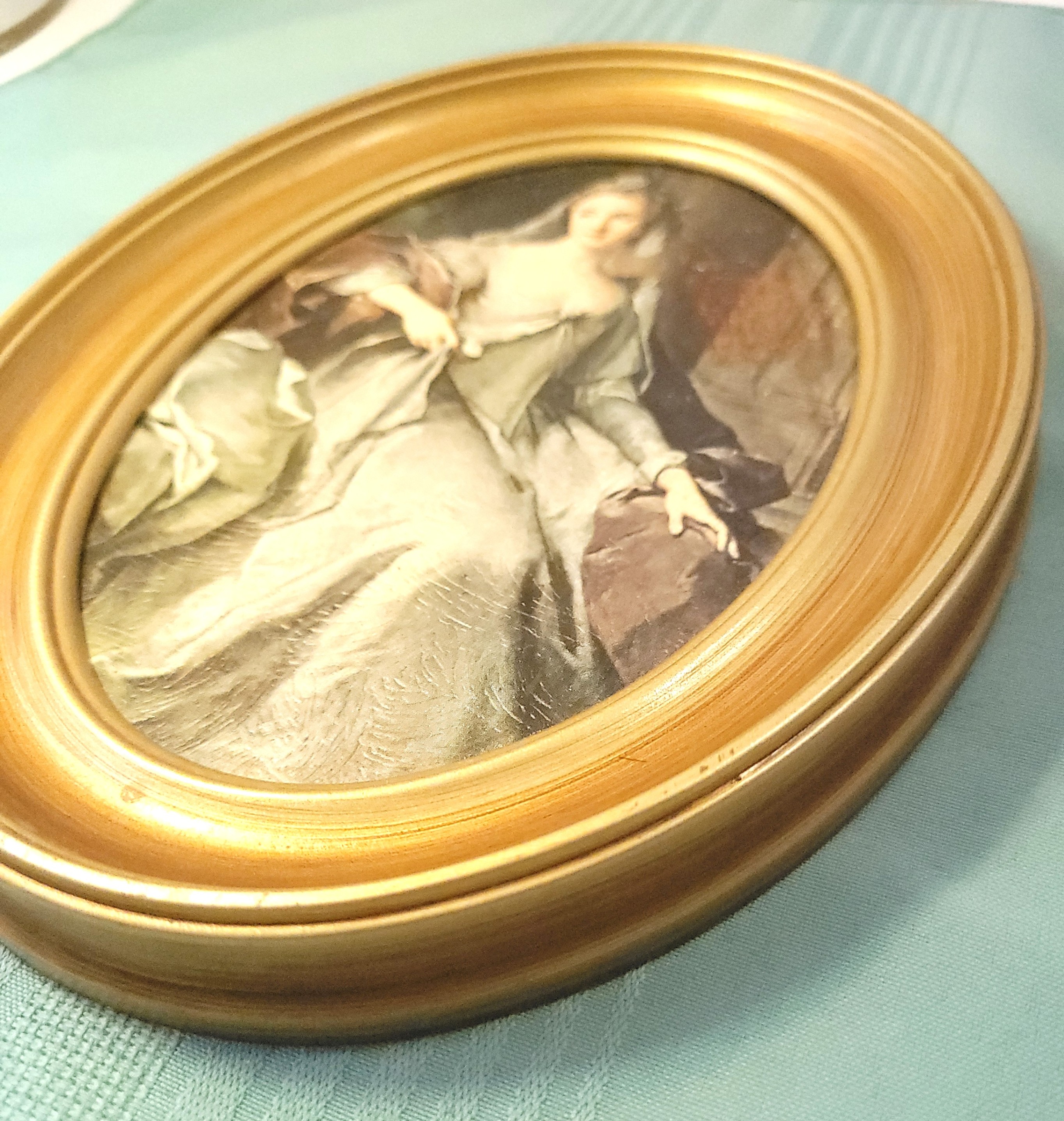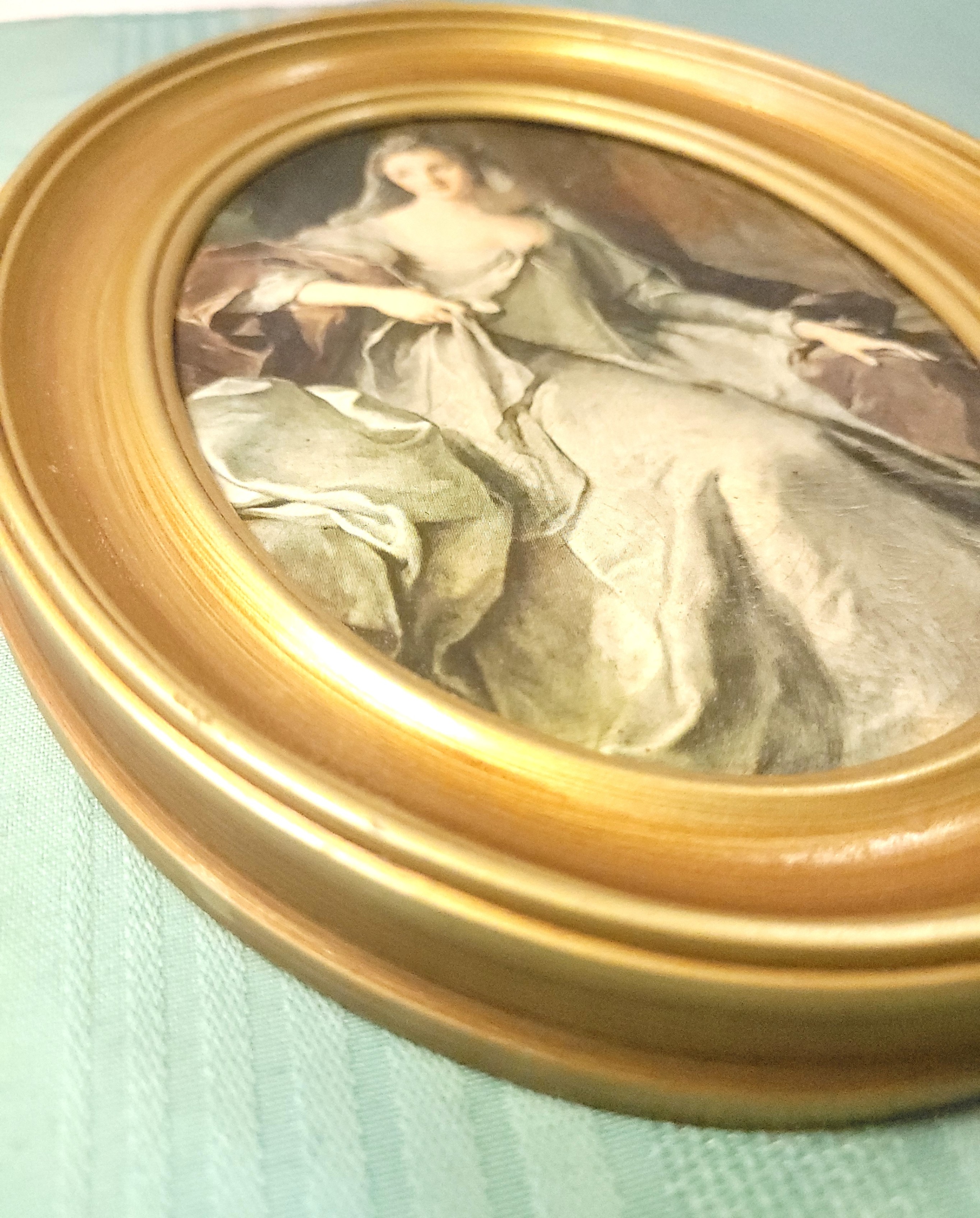 This item is in good vintage condition with light wear. As seen in the provided photos, there is light wear on the back of the piece, including some scuffing to the hardboard backing which is typical for a decorative item of this age. The front-facing gold frame and the portrait print remain in excellent, vibrant condition.