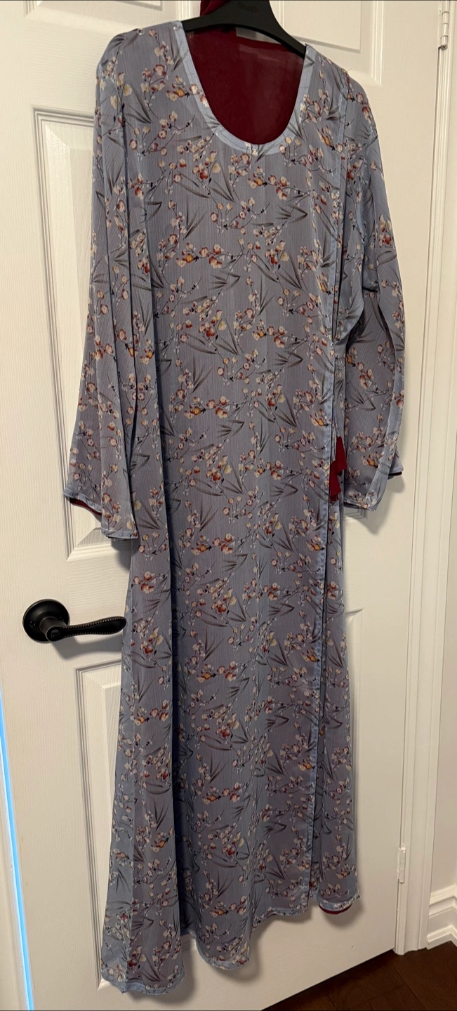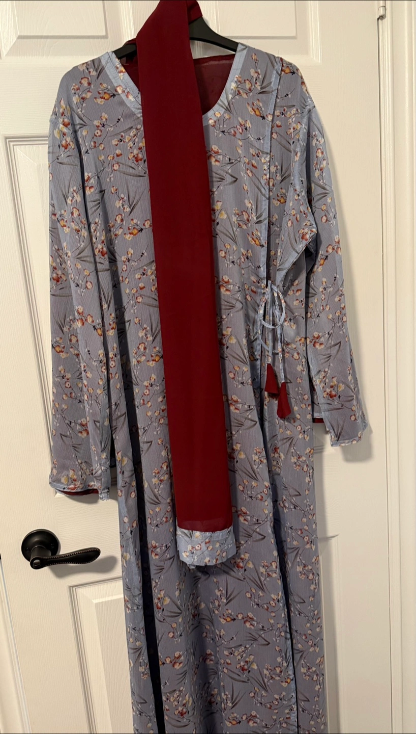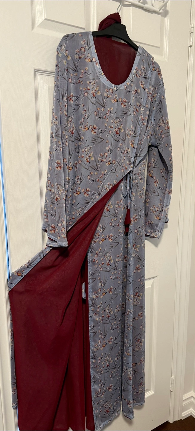 Selling a beautiful floral print abaya with a maroon lining and matching headscarf. The abaya features a tie at the waist and long sleeves. The material feels lightweight and comfortable, perfect for any occasion!