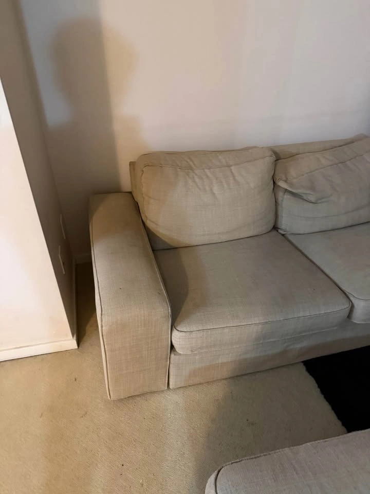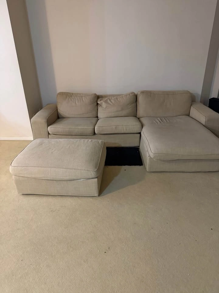 Selling a comfortable beige sectional sofa with chaise and matching ottoman. Perfect for living rooms or apartments. Includes ottoman. Neutral beige color (matches any decor). Very spacious and comfortable.