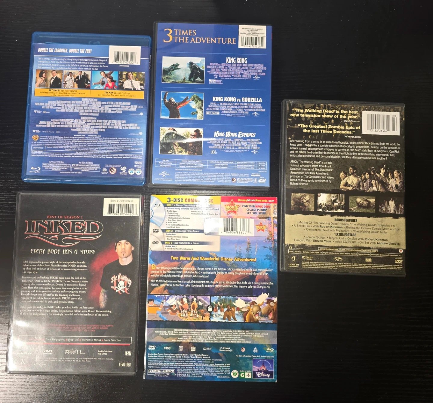 This collection includes 'Get Smart' Blu-Ray Double Feature, 'King Kong' Triple Feature with King Kong vs. Godzilla and King Kong Escapes, 'The Walking Dead' Complete First Season DVD, 'Inked' Best of Season 1 DVD, and a 3-Disc Blu-Ray/DVD combo of Disney's 'Brother Bear' and 'Brother Bear 2'. It's a diverse mix of action, monster movies, drama, and animated features.