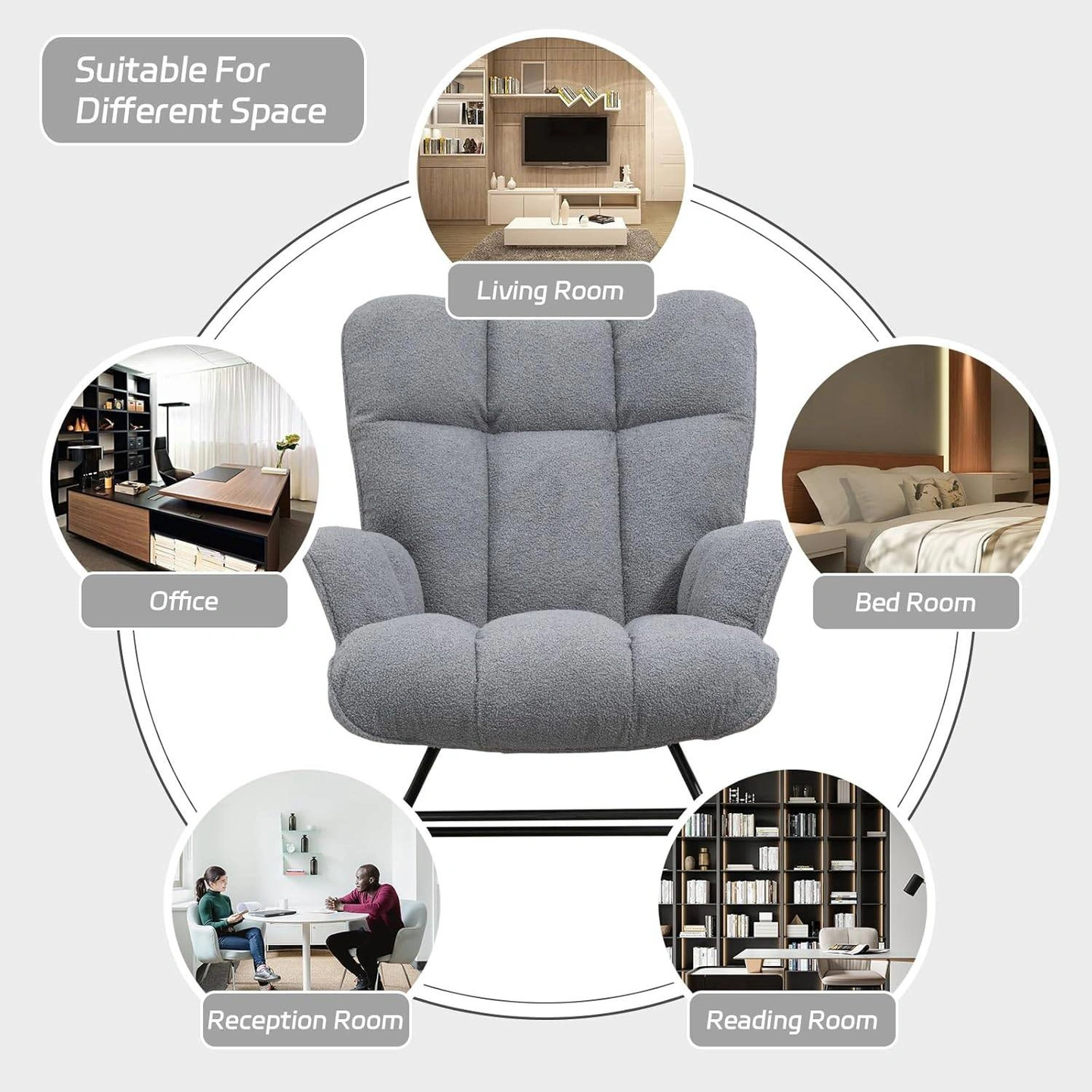 This comfy grey sherpa rocking chair is perfect for any room in the house! It features a sturdy metal frame and environmentally friendly wood rockers. The ergonomic design and cozy soft material make it a great place to relax. It's also designed to be no-slip and silent, so you can rock in peace