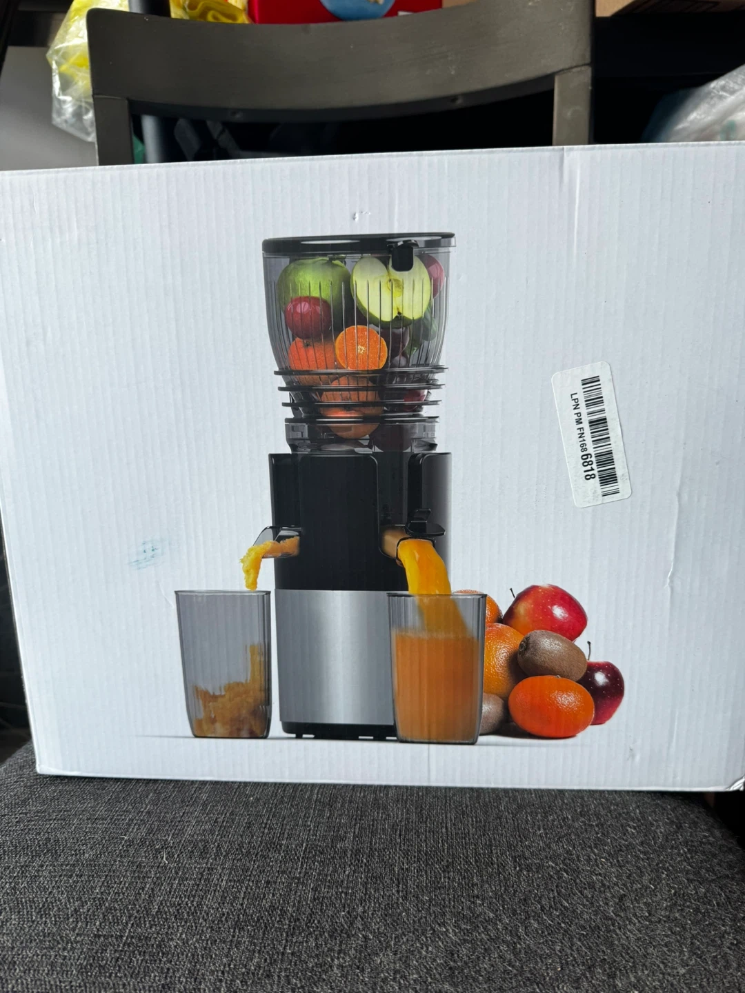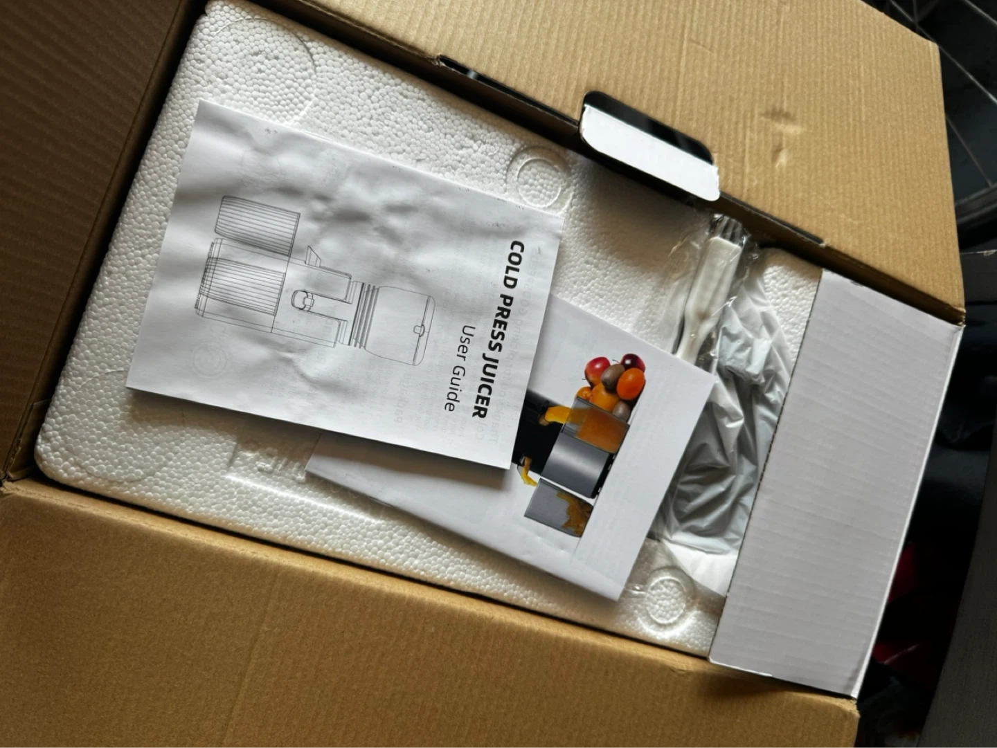 This cold press juicer comes in its original box. Includes user guide and cleaning brush. Makes fresh juice from fruits and vegetables.