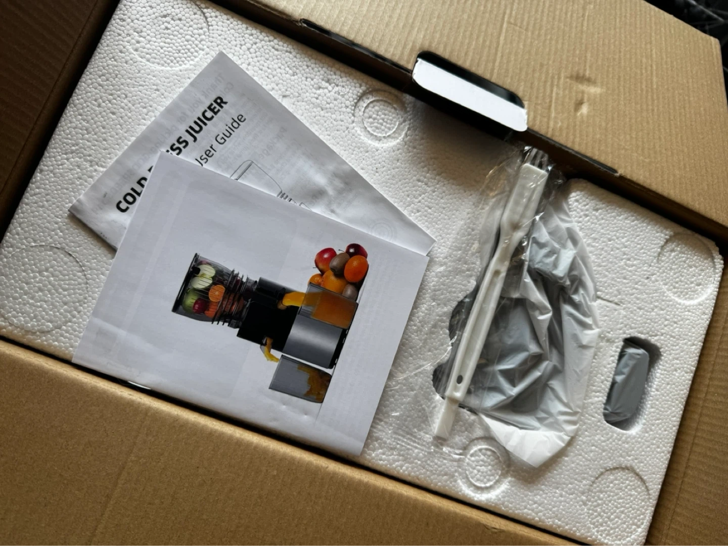 This cold press juicer comes in its original box. Includes user guide and cleaning brush. Makes fresh juice from fruits and vegetables.