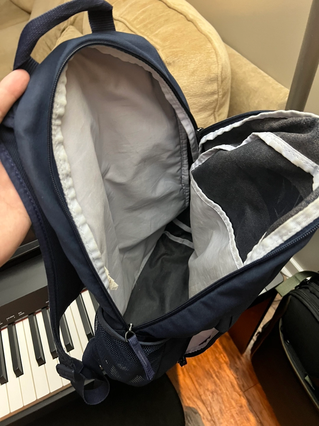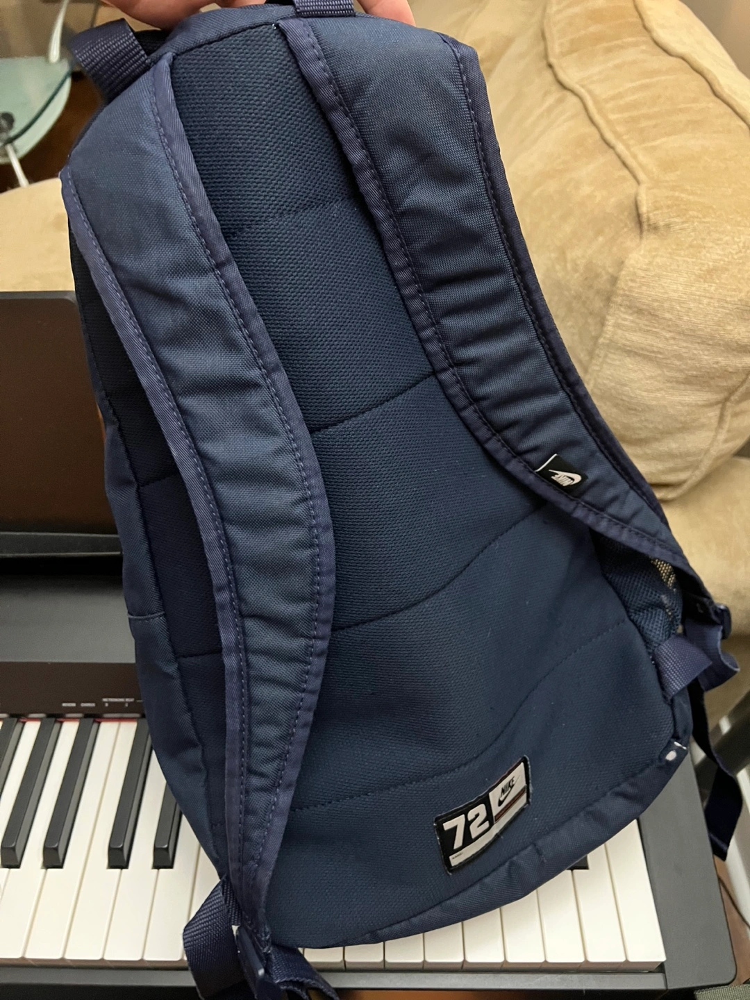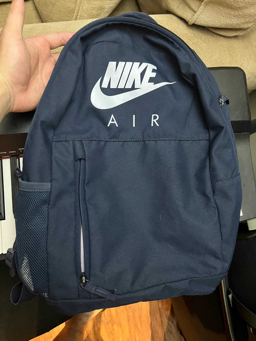 Selling a Nike Air backpack in navy blue! It's in great condition and perfect for everyday use or travel. It has a spacious main compartment and a front pocket for smaller items.