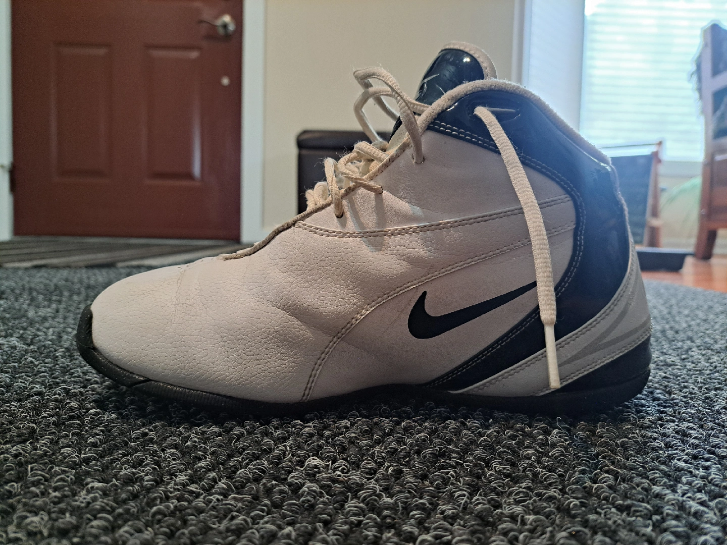 60Selling a pair of Nike air basketball shoes. They show some signs of wear but are still in good condition for playing ball or casual wear. Still has an excellent grip, it has good support and padding. Leather has a few creases but is still clean and white.