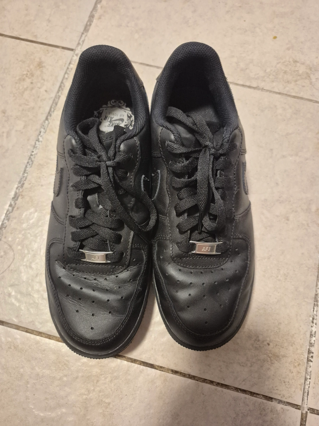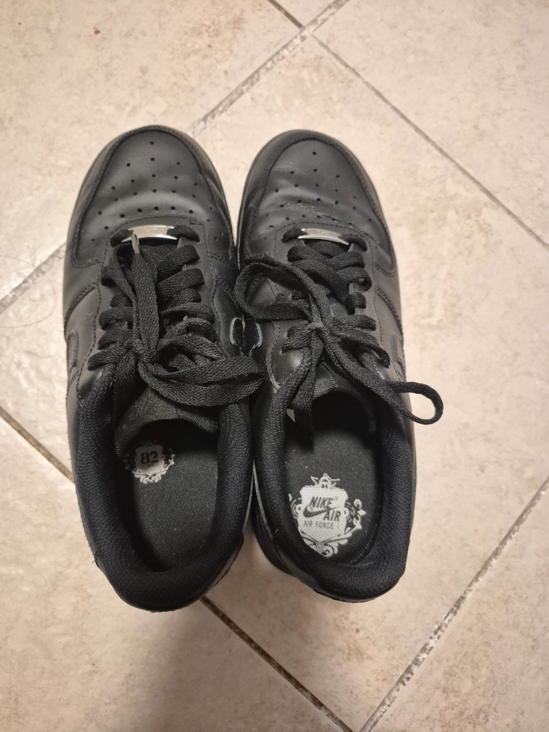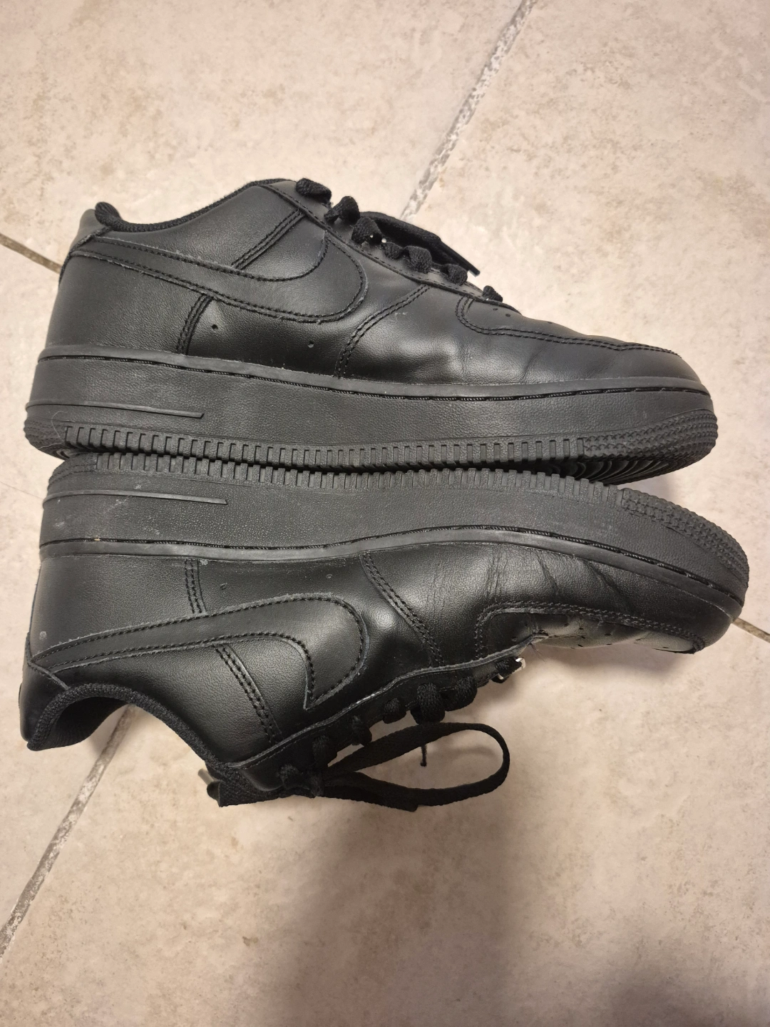 Classic black leather Nike Air Force 1 sneakers. Low-top design. Black laces. Minimal wear.