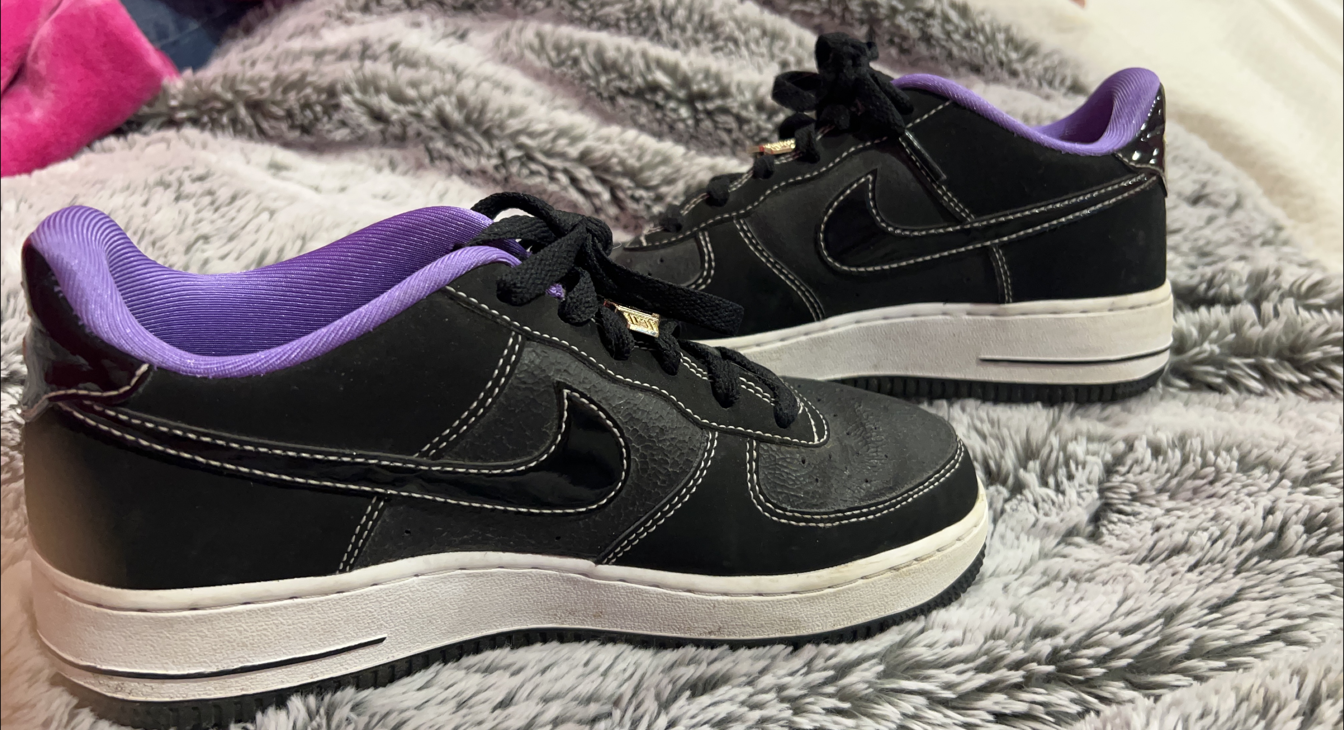 Here are a pair of Nike Air Force 1s! They are black with purple lining and white soles. They are in good condition!
