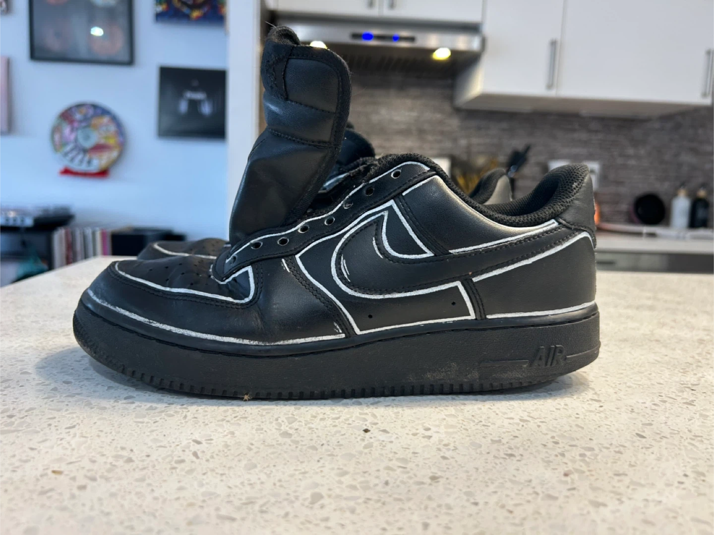 67Selling a pair of Nike Air Force 1 High '07 in black, size 9. They have a unique design with white outlines. Please see the photos for condition! No laces, price can be negotiated
