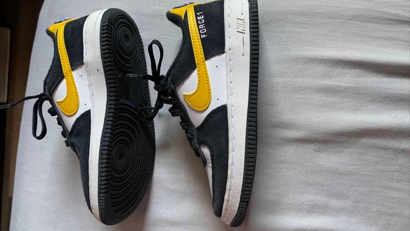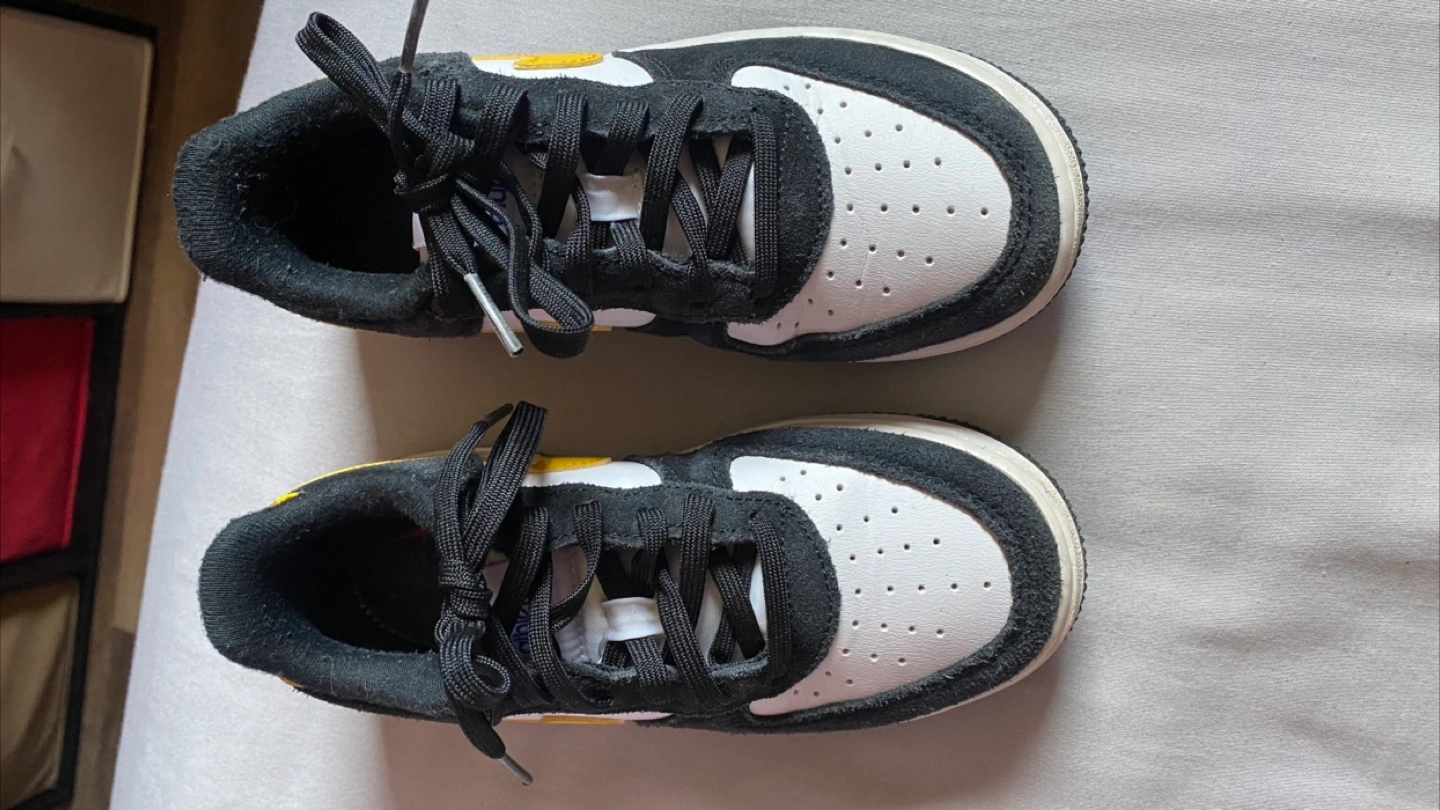 Selling a pair of Nike Air Force 1 kids shoes in excellent condition! They are a size 13C (US). The shoes feature a stylish black, white, and yellow colour scheme. Perfect for your little one!