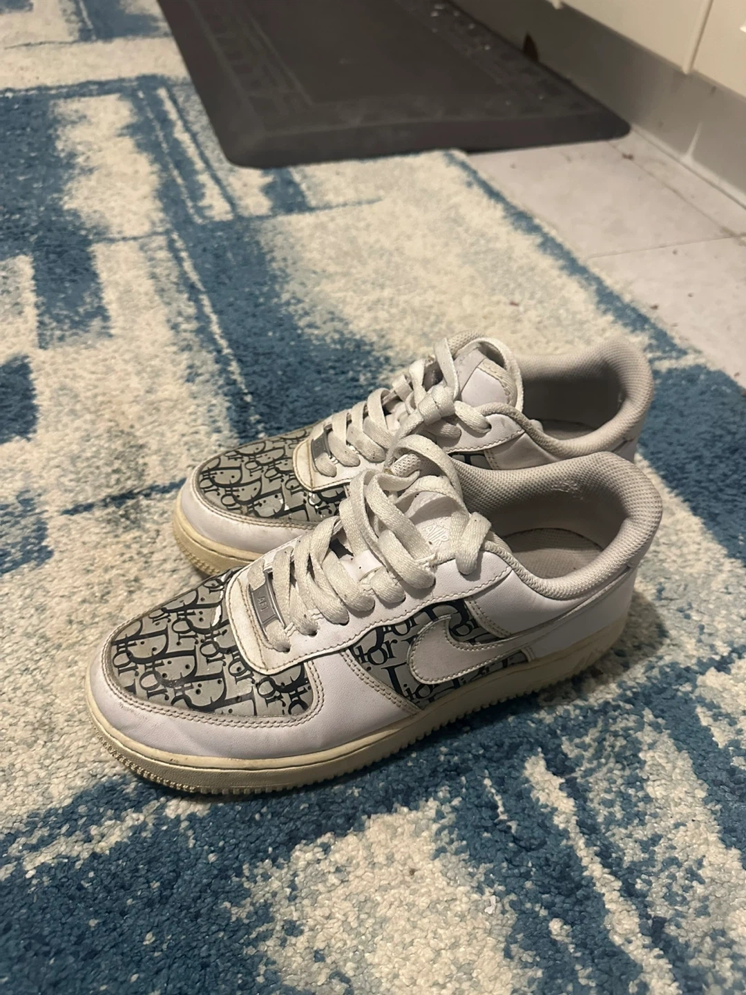 65Selling a pair of Nike Air Force 1 Low sneakers with the Dior pattern. These are in used condition, as shown in the photos. They are white with grey accents.