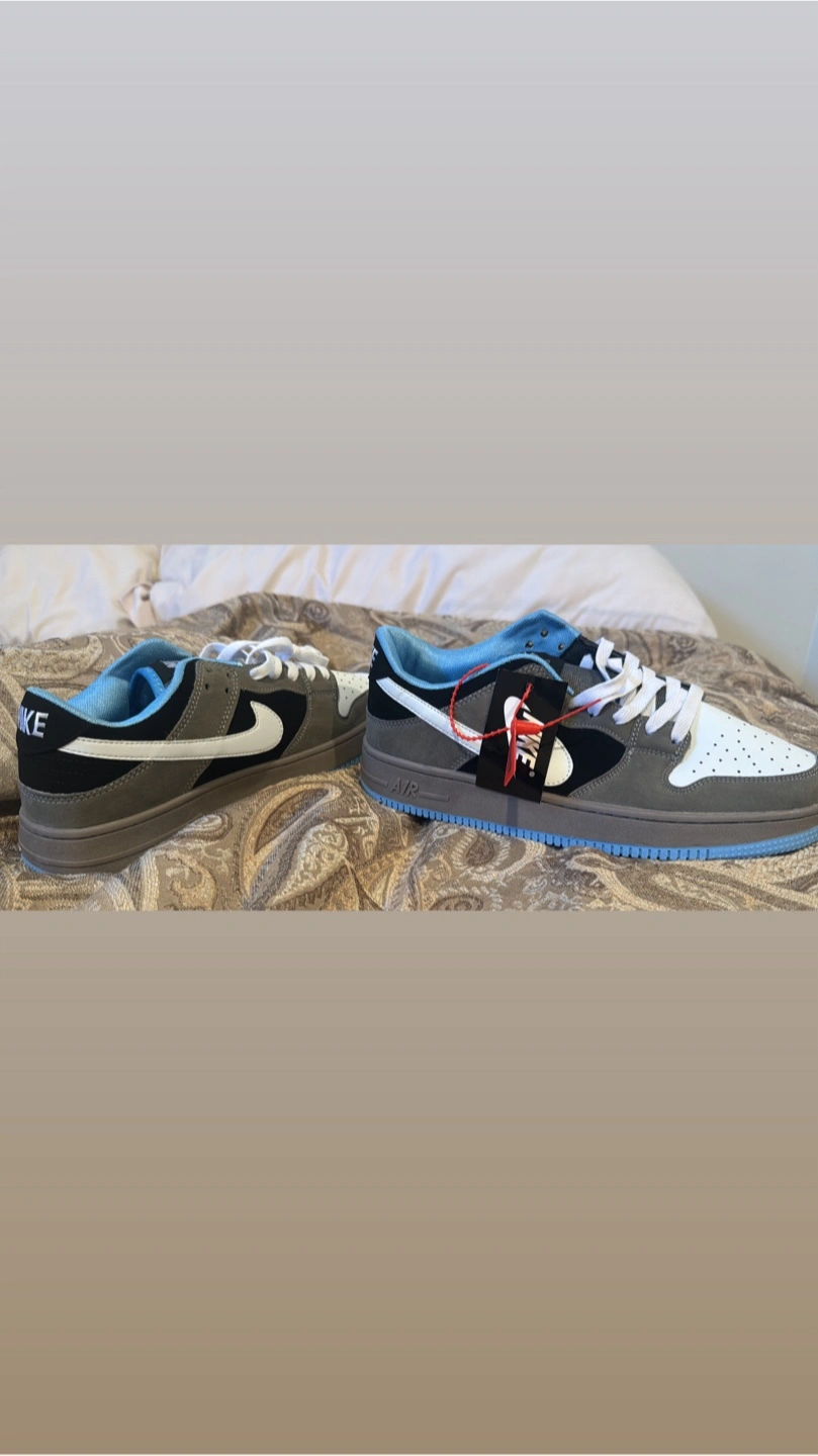 Selling a pair of Nike Air Force 1 Low sneakers in a stylish grey and white colourway! These shoes have a sleek design with a pop of light blue on the sole and lining. They are in great condition and ready for a new home!