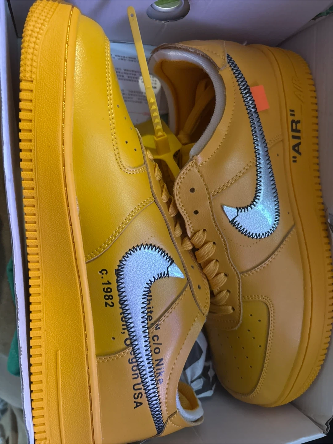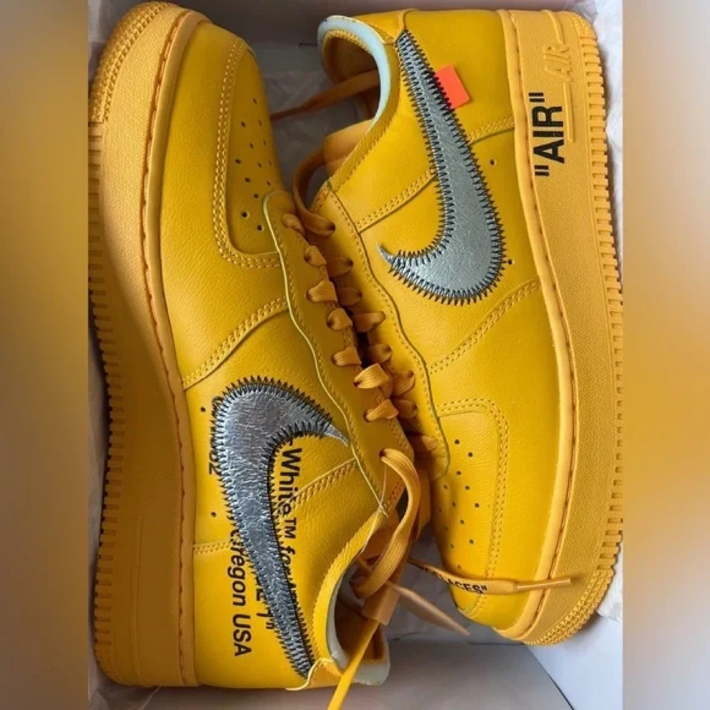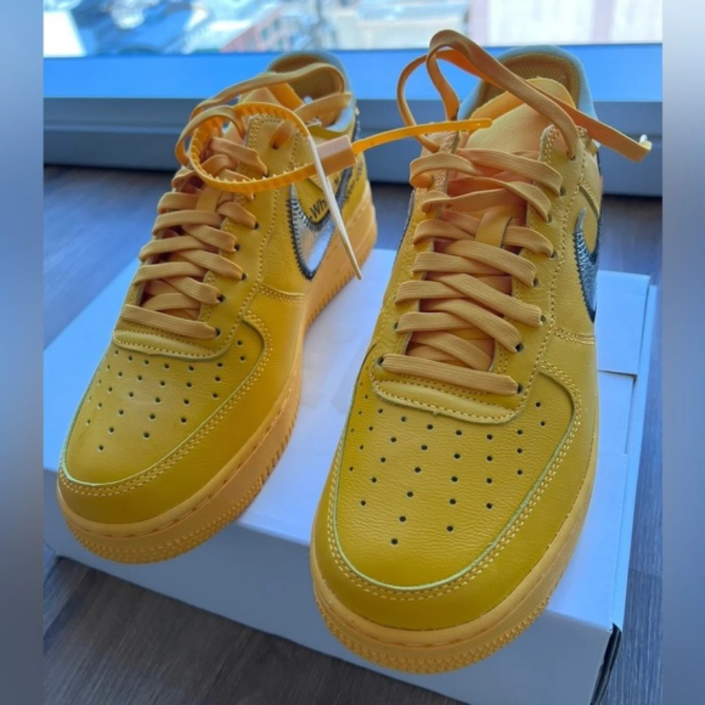 These Nike Air Force 1 Low Off-White University Gold sneakers are in great condition and come with the original box! - Brand: Nike - Model: Air Force 1 Low Off-White - Color: University Gold - Size: Men's 10