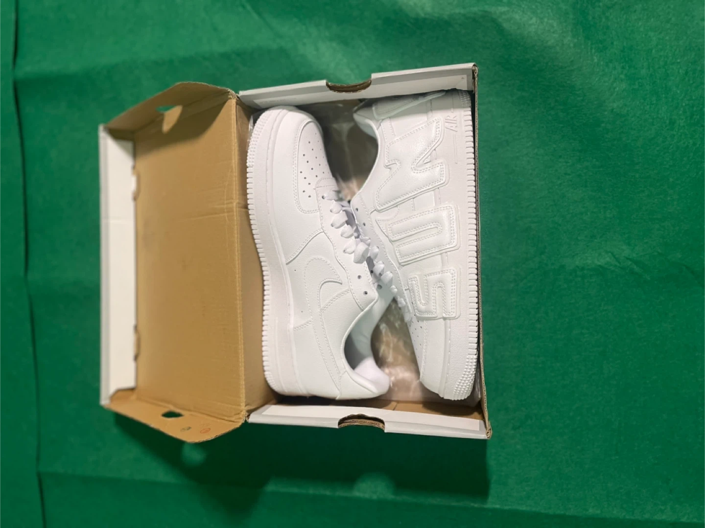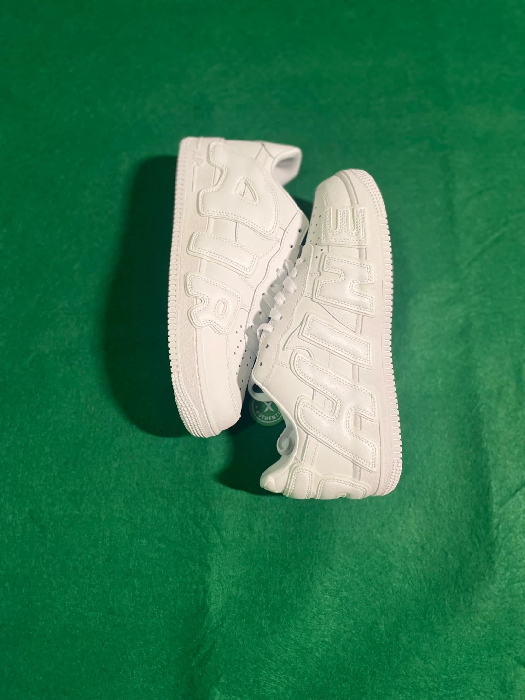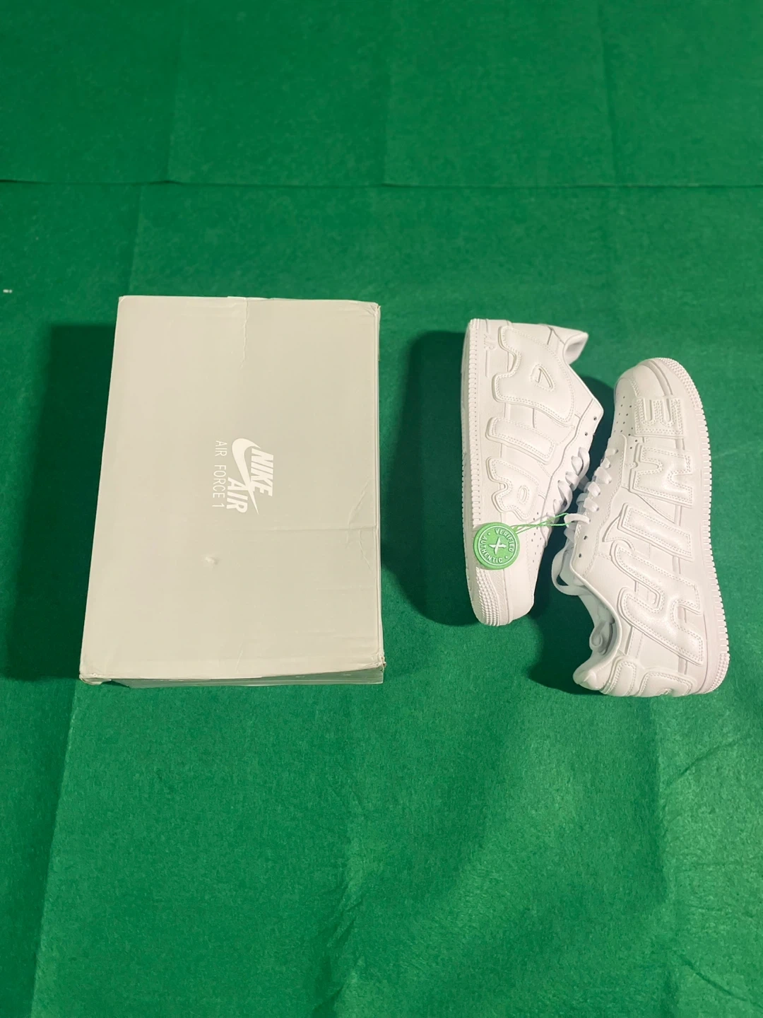 12Selling a pair of Nike Air Force 1 Low Supreme sneakers in white. They come with the original box. These are a stylish and iconic addition to any sneaker collection!