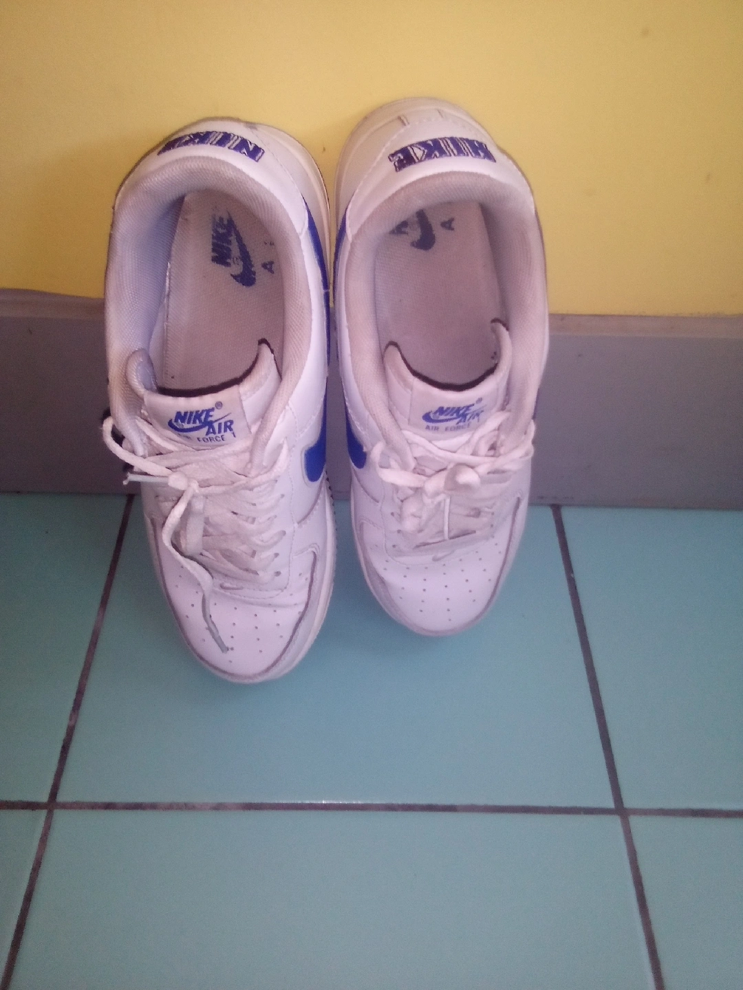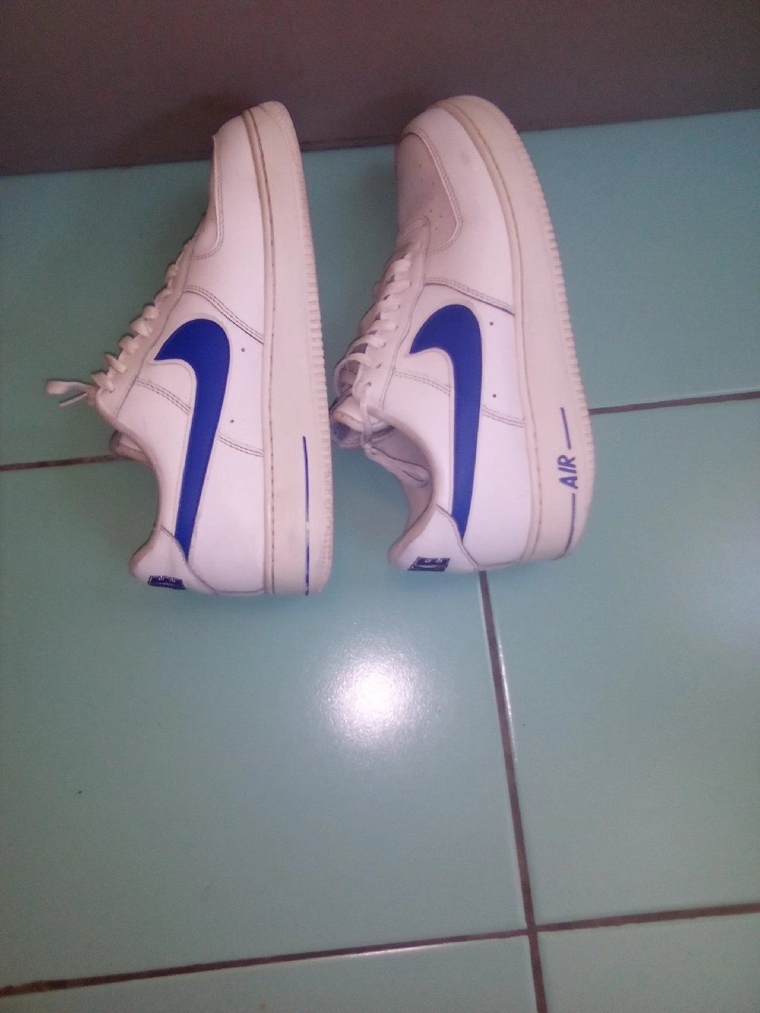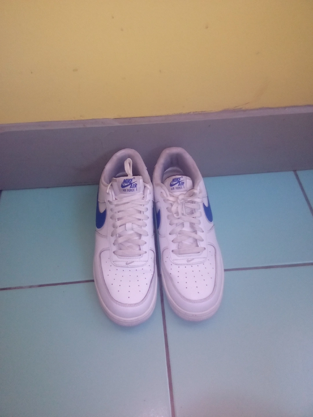 Selling a pair of Nike Air Force 1 Low sneakers in white with blue accents. They are in good condition and the size is US 10. Perfect for everyday wear!