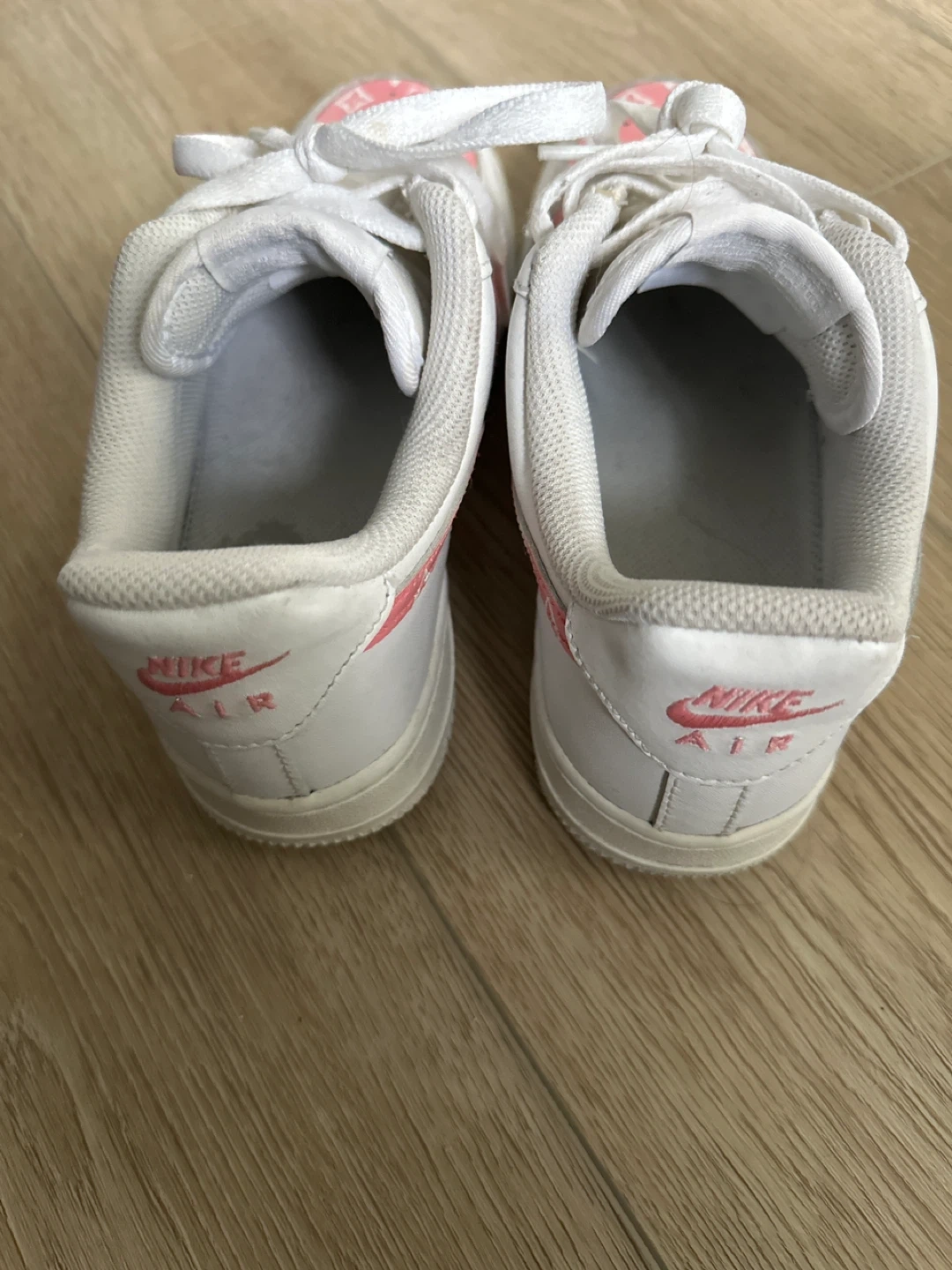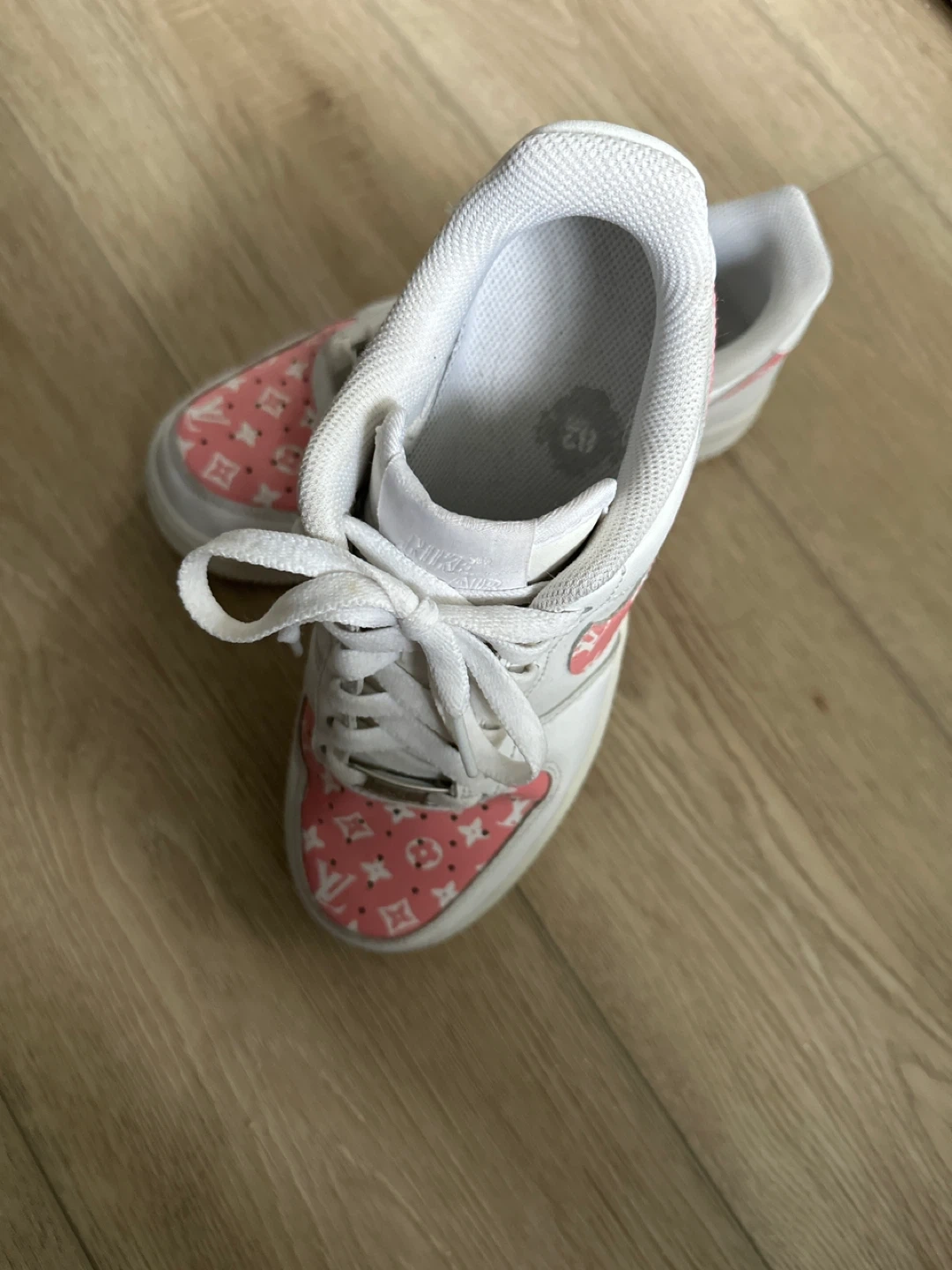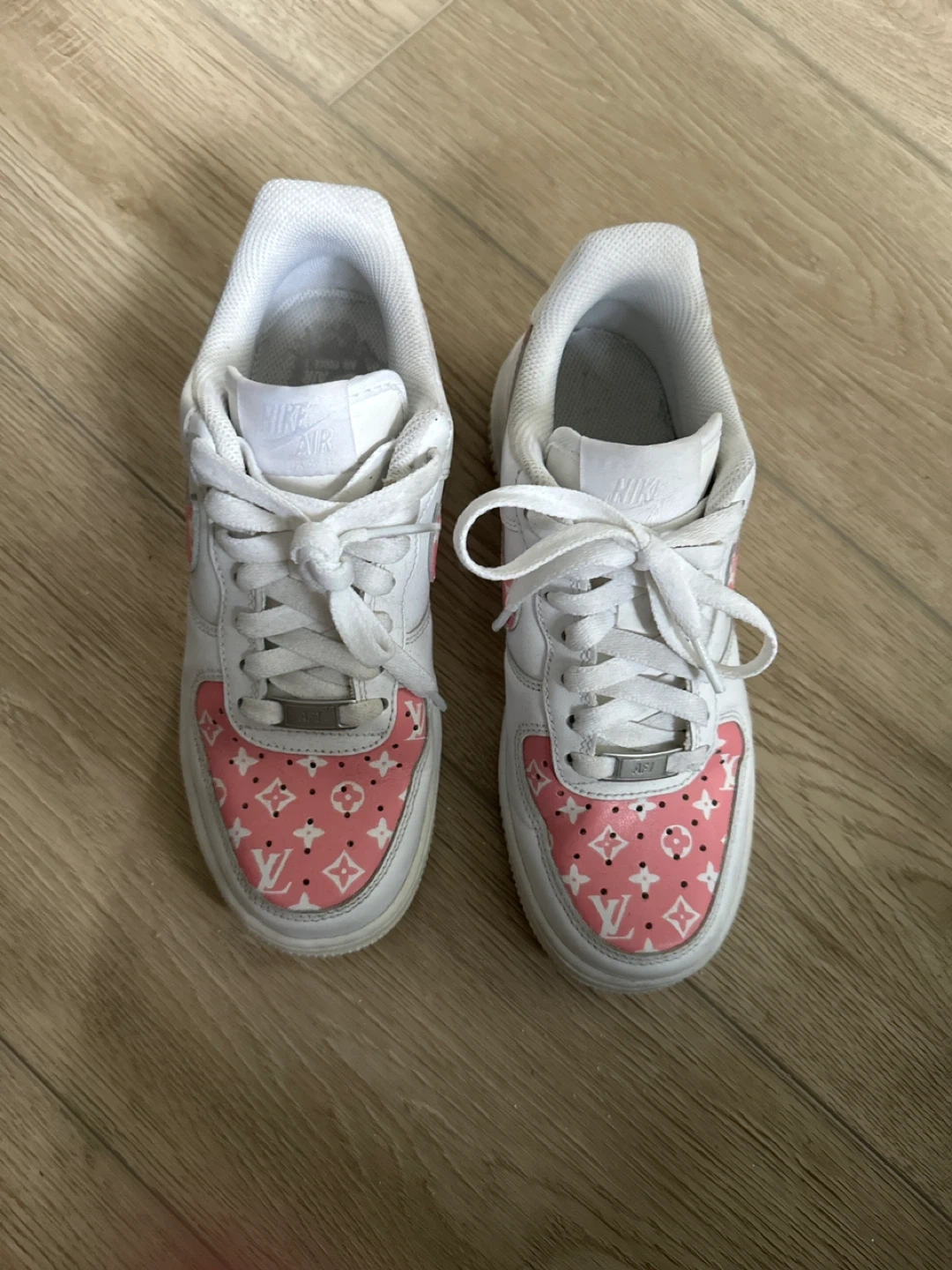 86Selling a pair of Nike Air Force 1 shoes in white and pink with LV design. The size is 6 US.