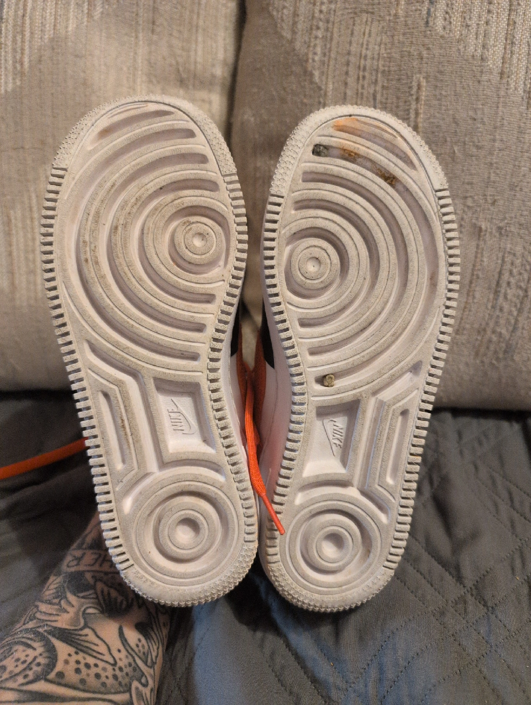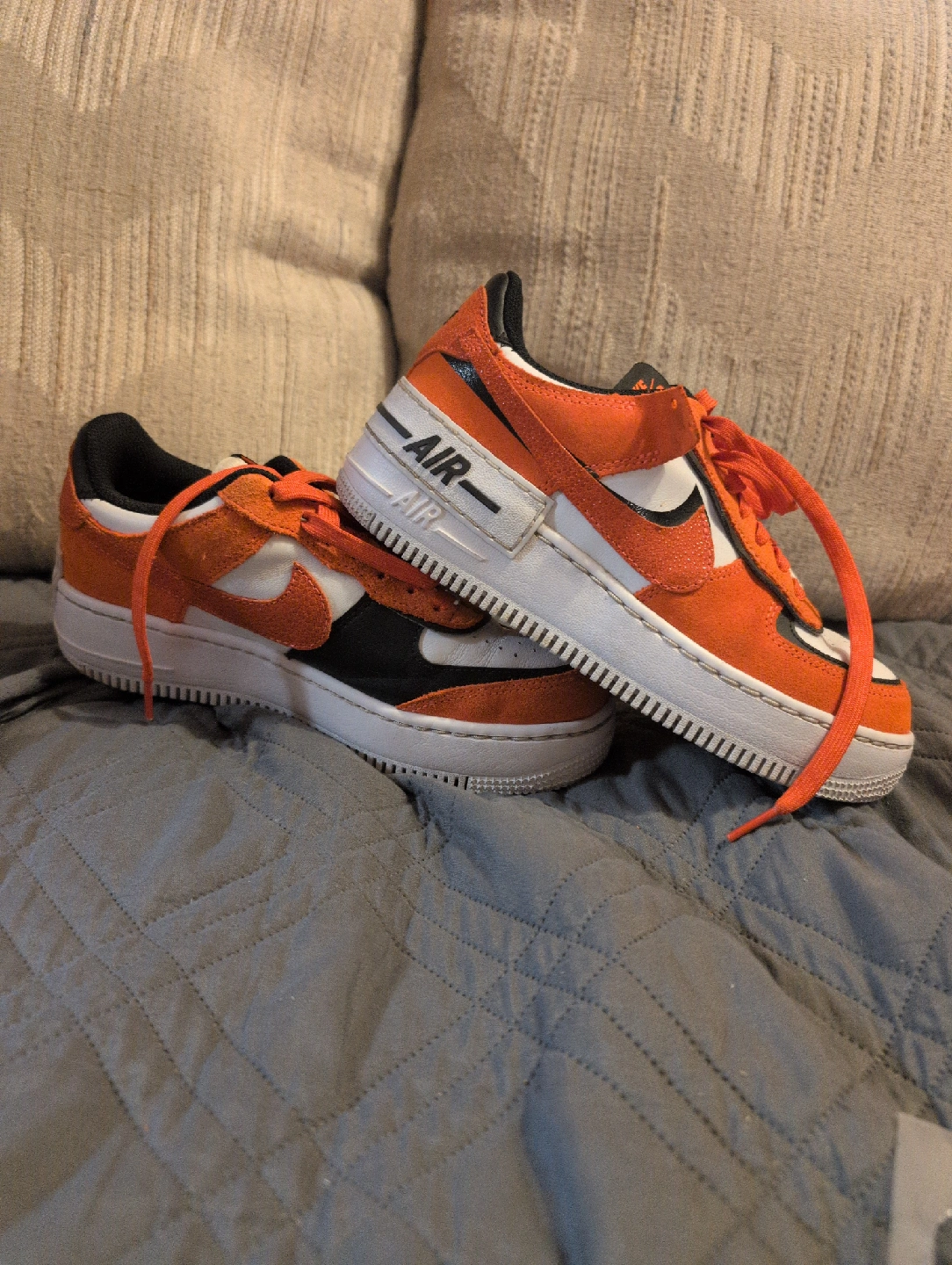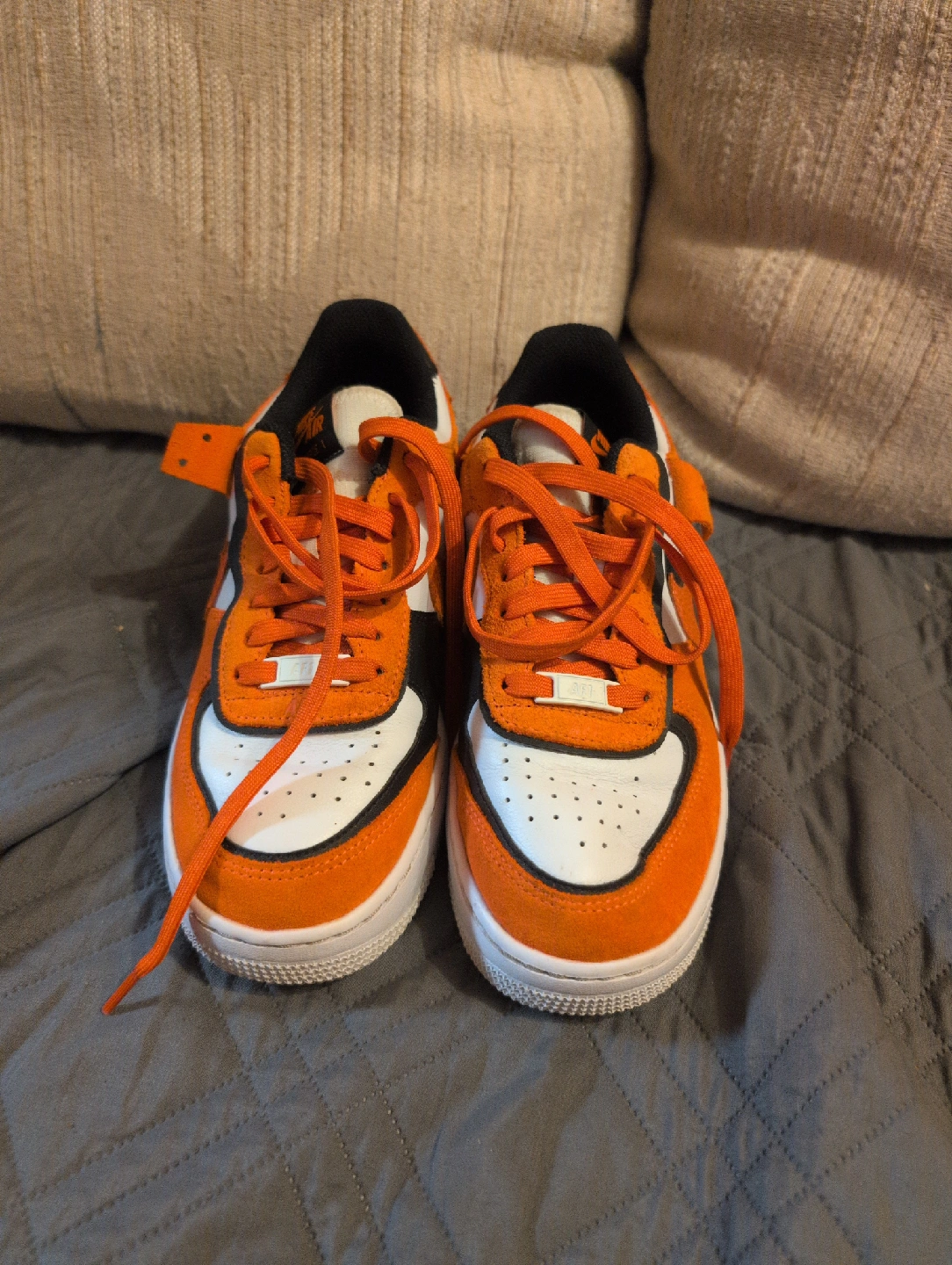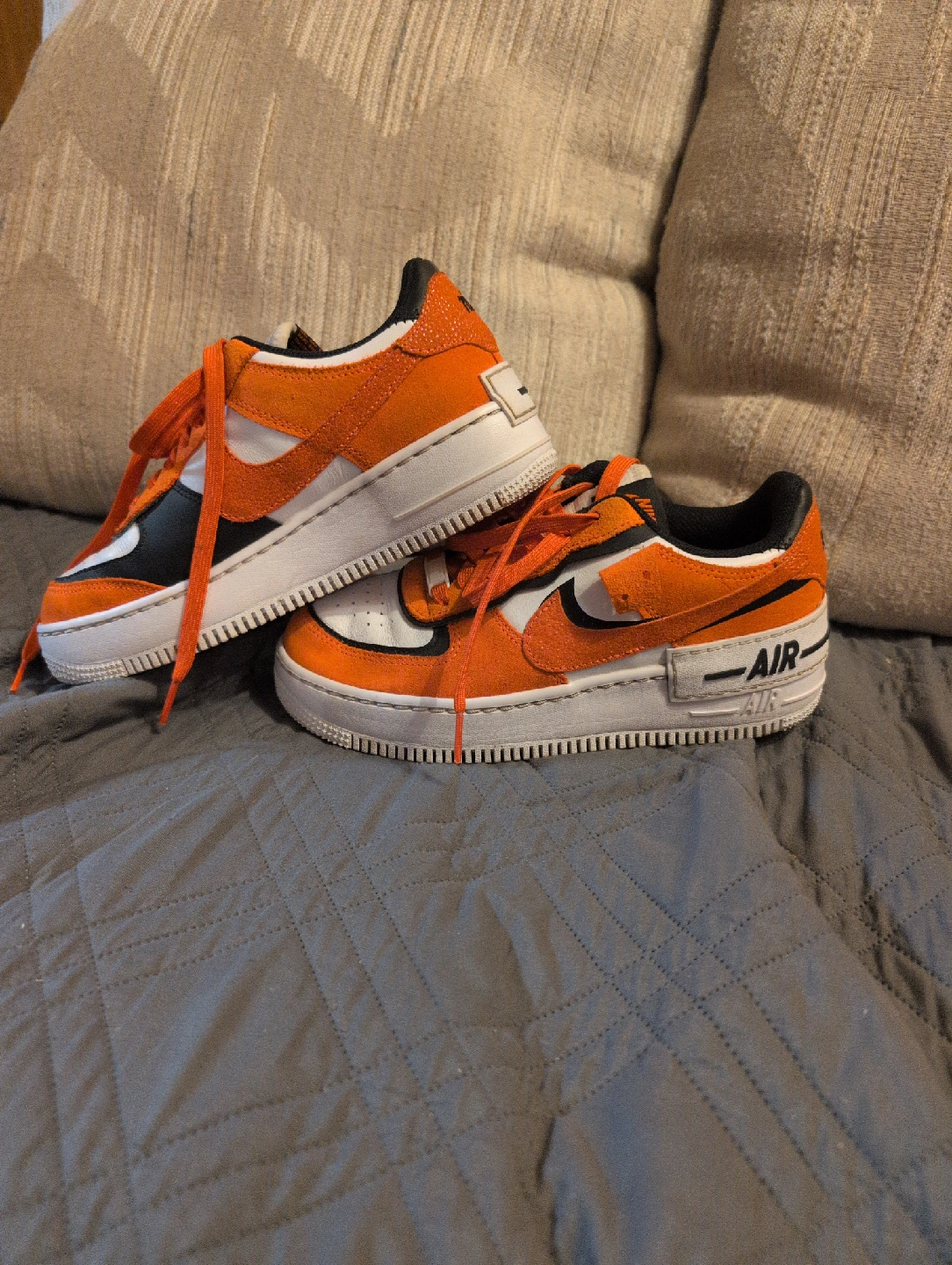These Nike Air Force 1 Shadow sneakers are in great shape and ready for a new home! The vibrant orange colour is sure to make a statement. They have a unique layered design and comfortable fit. Perfect for adding a pop of colour to your everyday look!