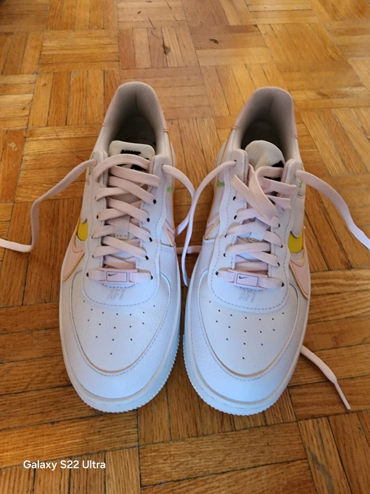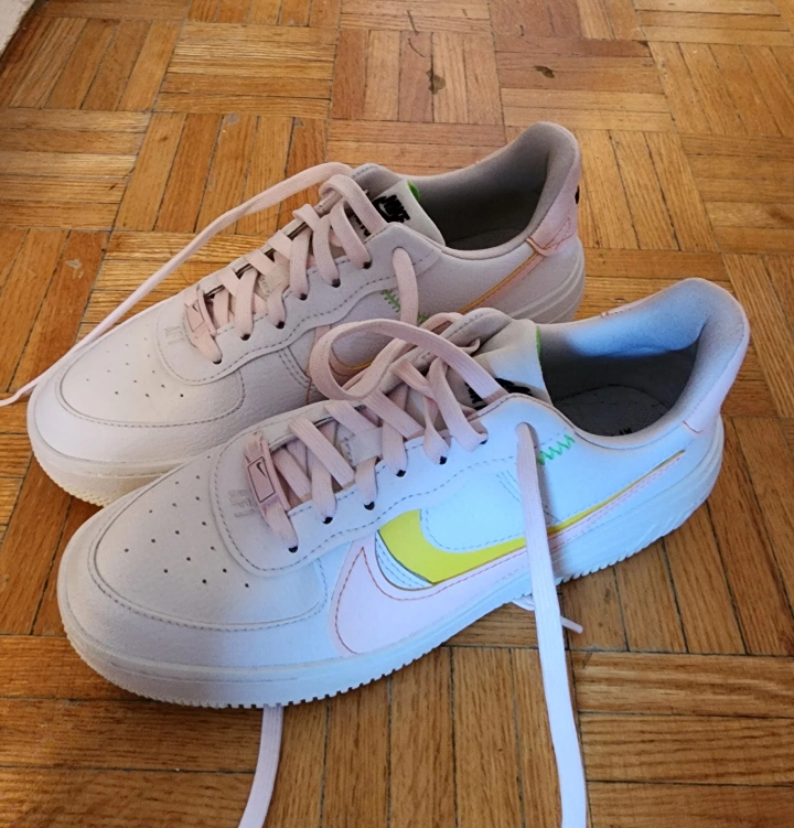 Women's Nike Air Force 1 Shadow sneakers. Size US 8. Pale pink and white colourway. Light yellow and green accents. Clean, minimalist design. Casual, everyday wear.