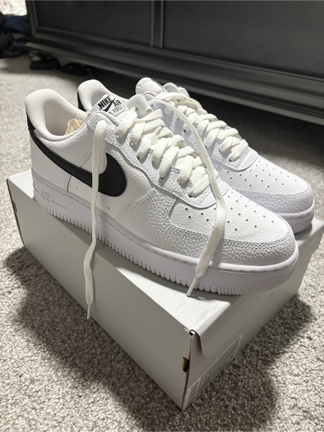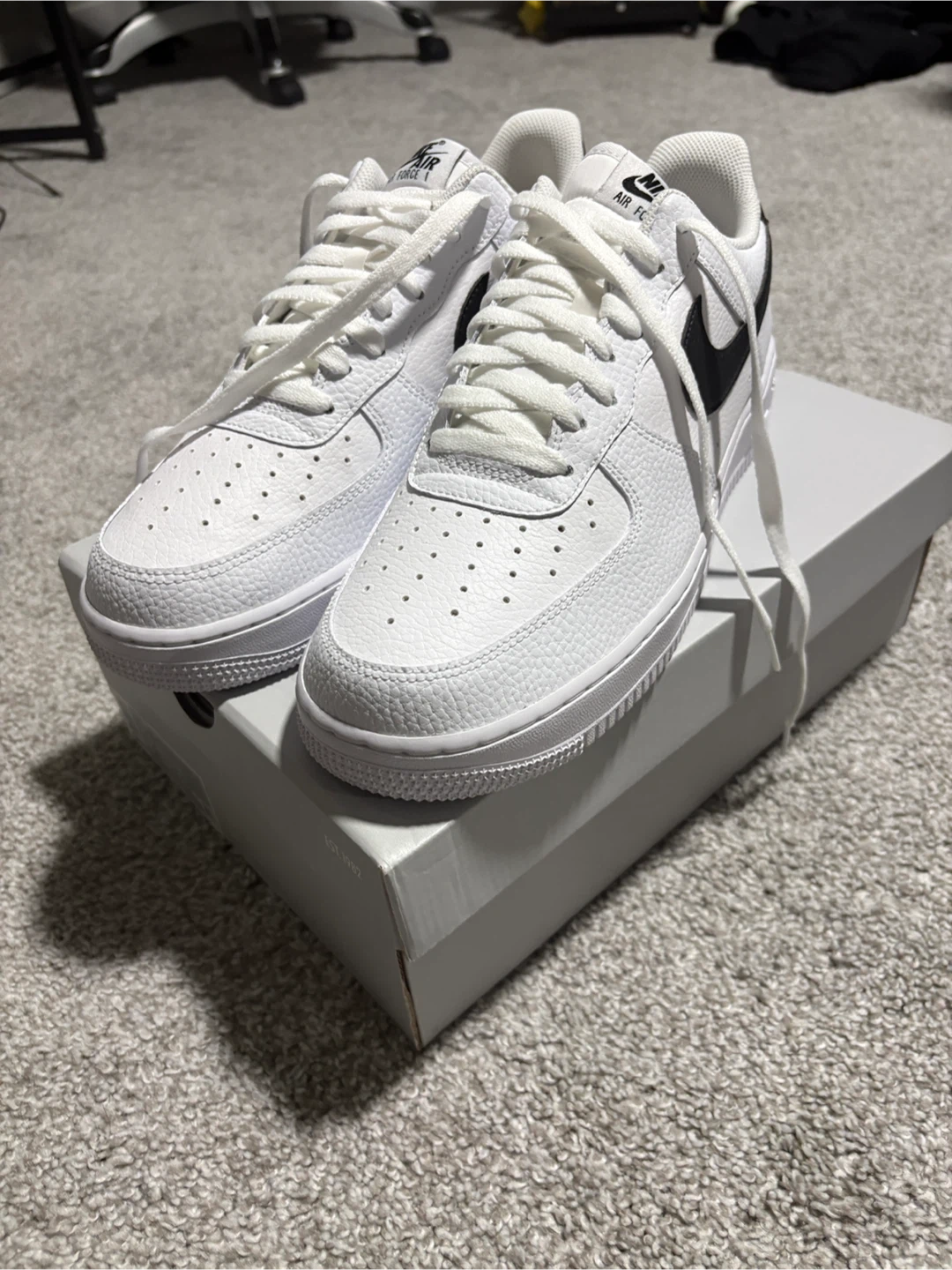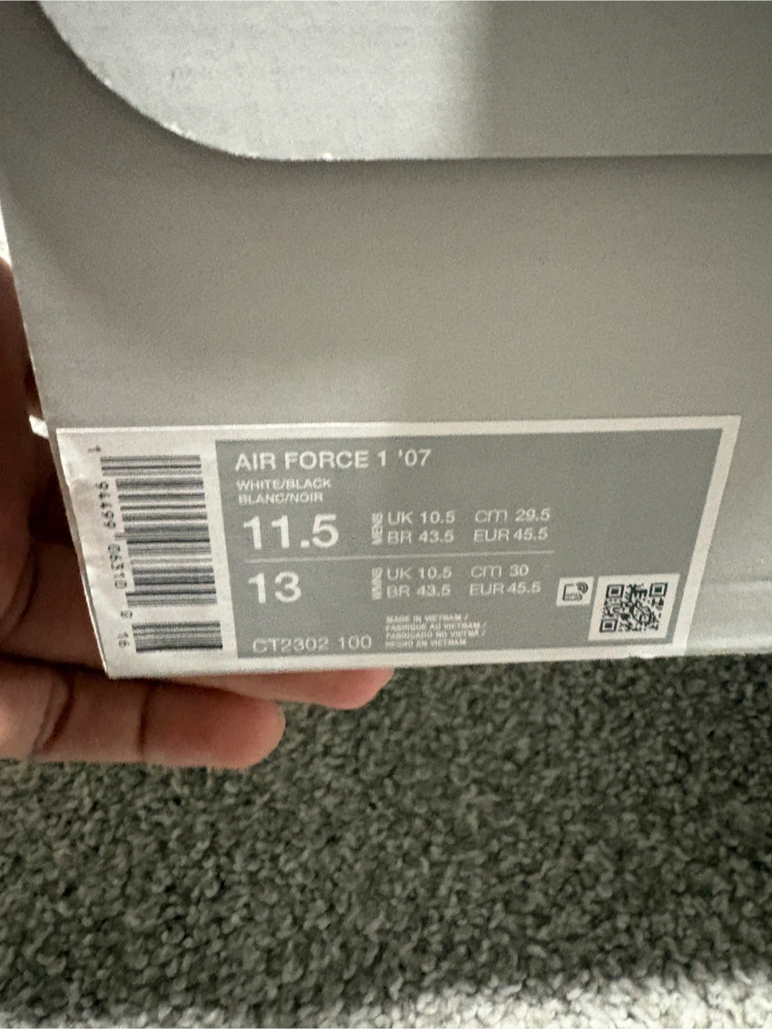 71Selling a pair of Nike Air Force 1 '07 in white and black. They come with the original box and are in great condition. The size is US 11.5, UK 10.5, EUR 45.5. With crease protectors
