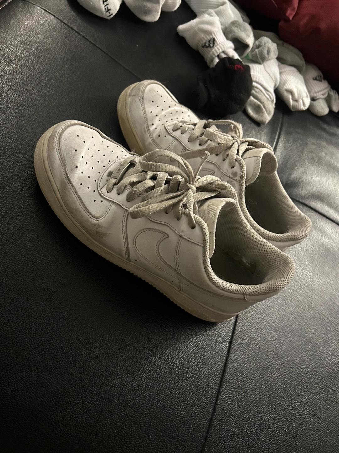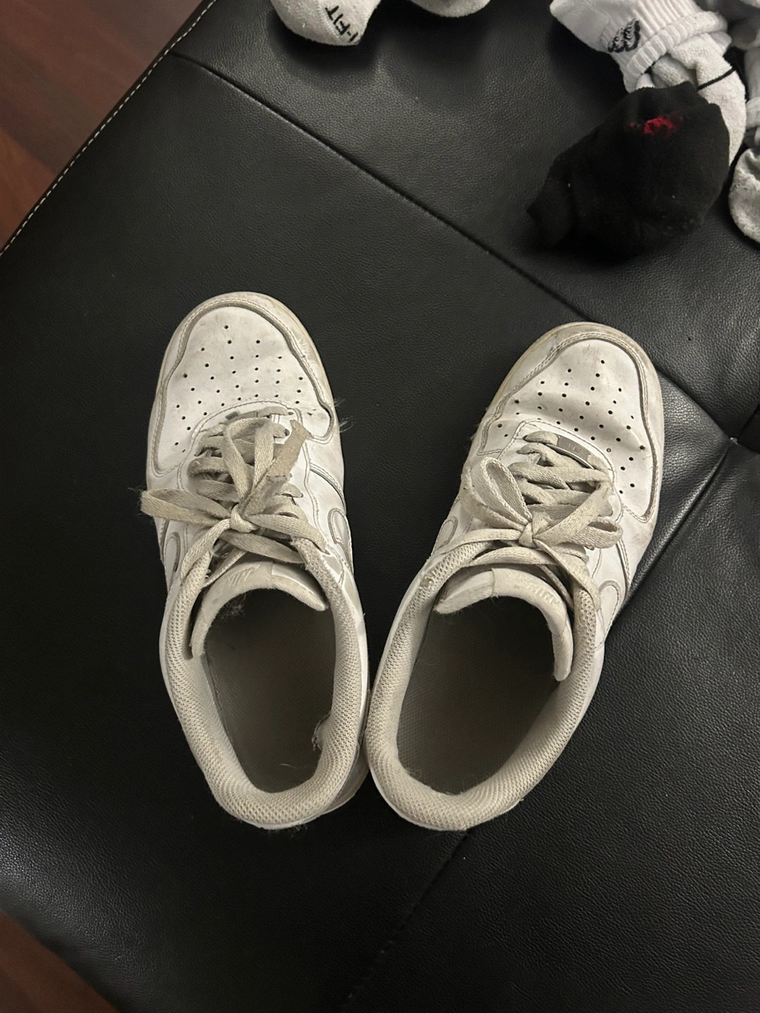 White sneakers. Feature laces. Show visible wear. Perfect for a casual day out.