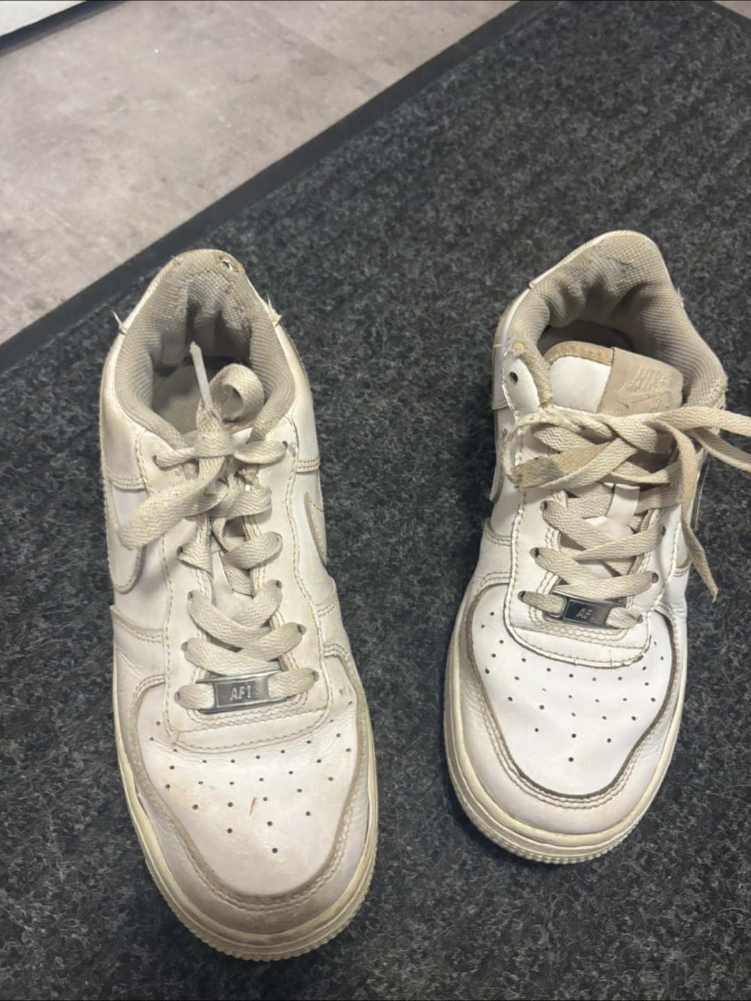 Selling a pair of classic Nike Air Force 1 sneakers. They're white and have the AF1 logo on the front. They show some signs of wear, but still have lots of life left!