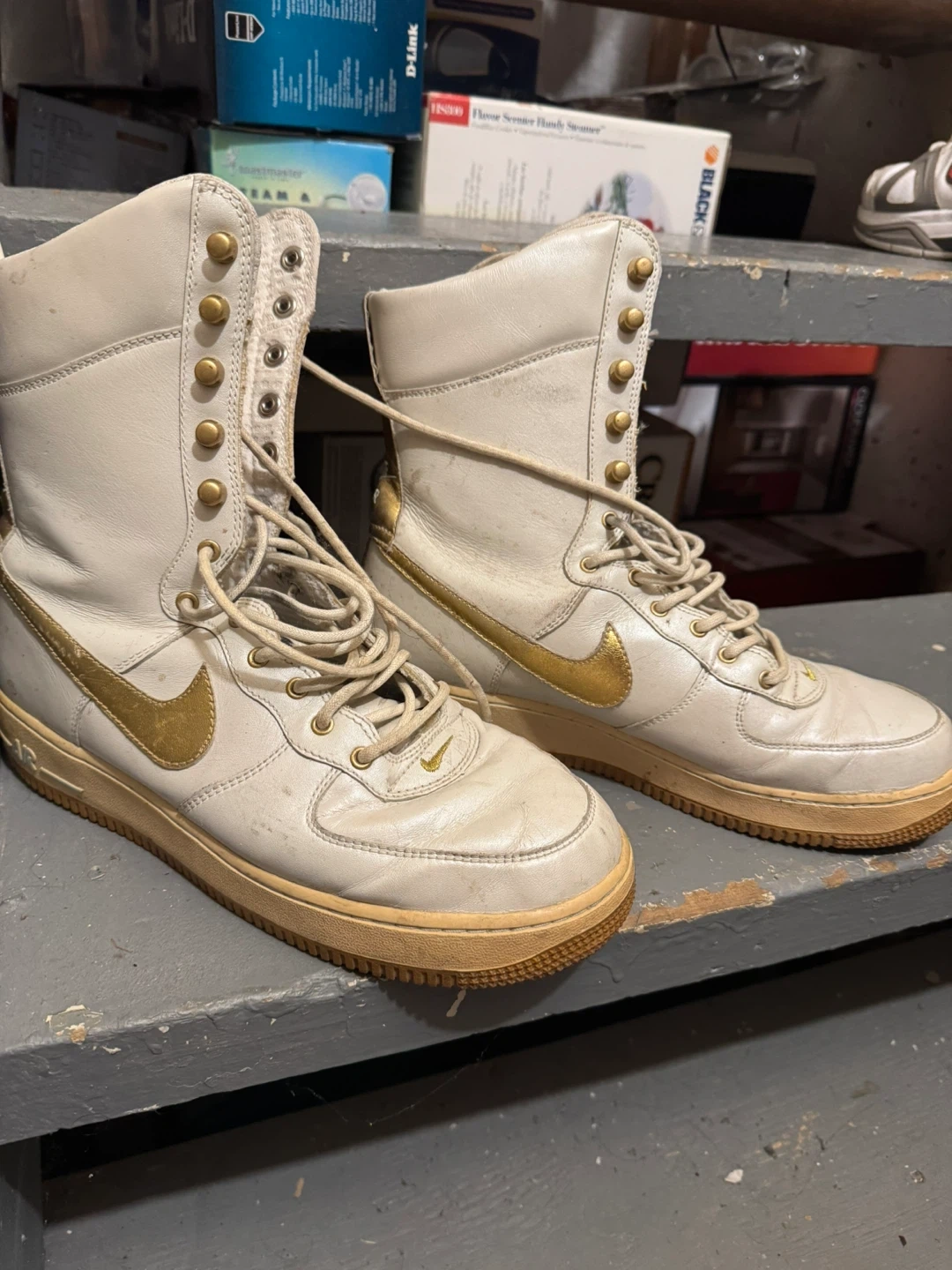 Selling a pair of Nike Air Force 1 VF high-top boots! These are a unique style with a high-top design and gold accents. They're in used condition, as you can see in the photos. The size is US 10.