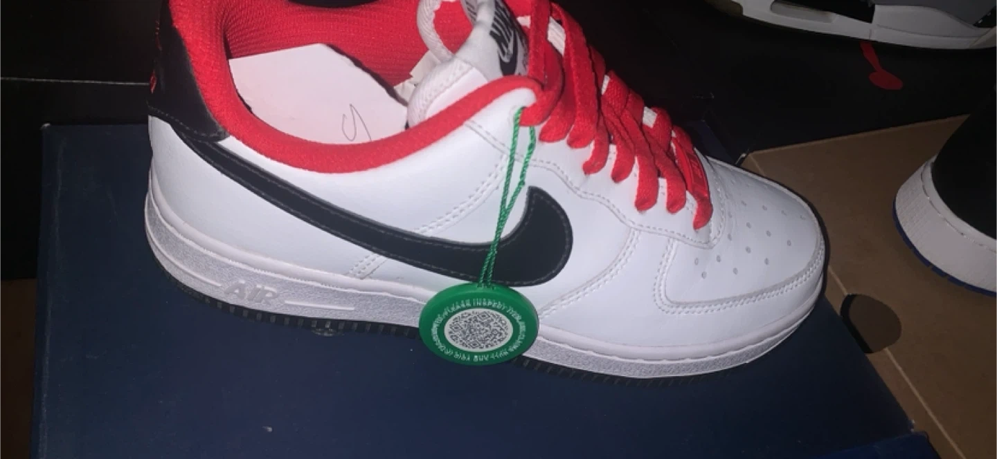 Here are some Nike Air Force 1s in a white, black, and red colourway! They are in great condition and ready for a new home