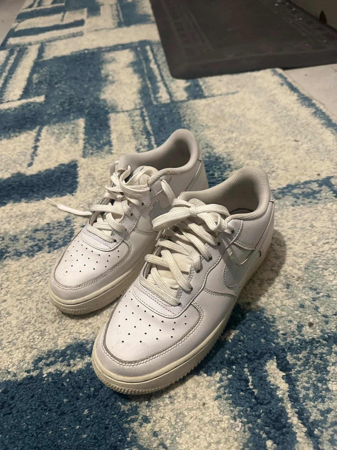 65Selling a pair of white Nike Air Force 1 sneakers! They show some signs of wear, as you can see in the photos. Still lots of life left in them, though!