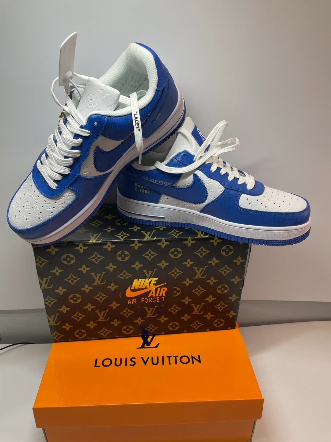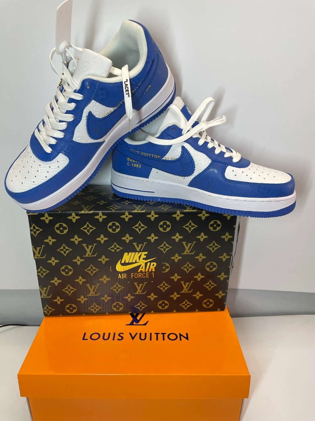 These are a pair of Nike Air Force 1 sneakers customized with Louis Vuitton details. They come in a striking blue color and include the original box