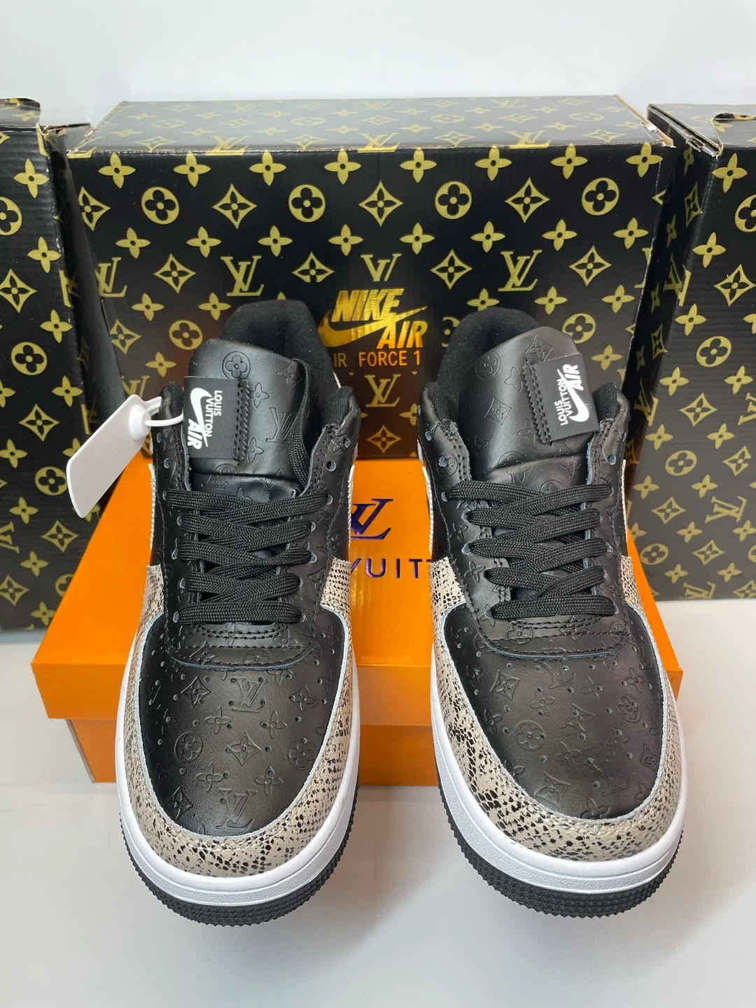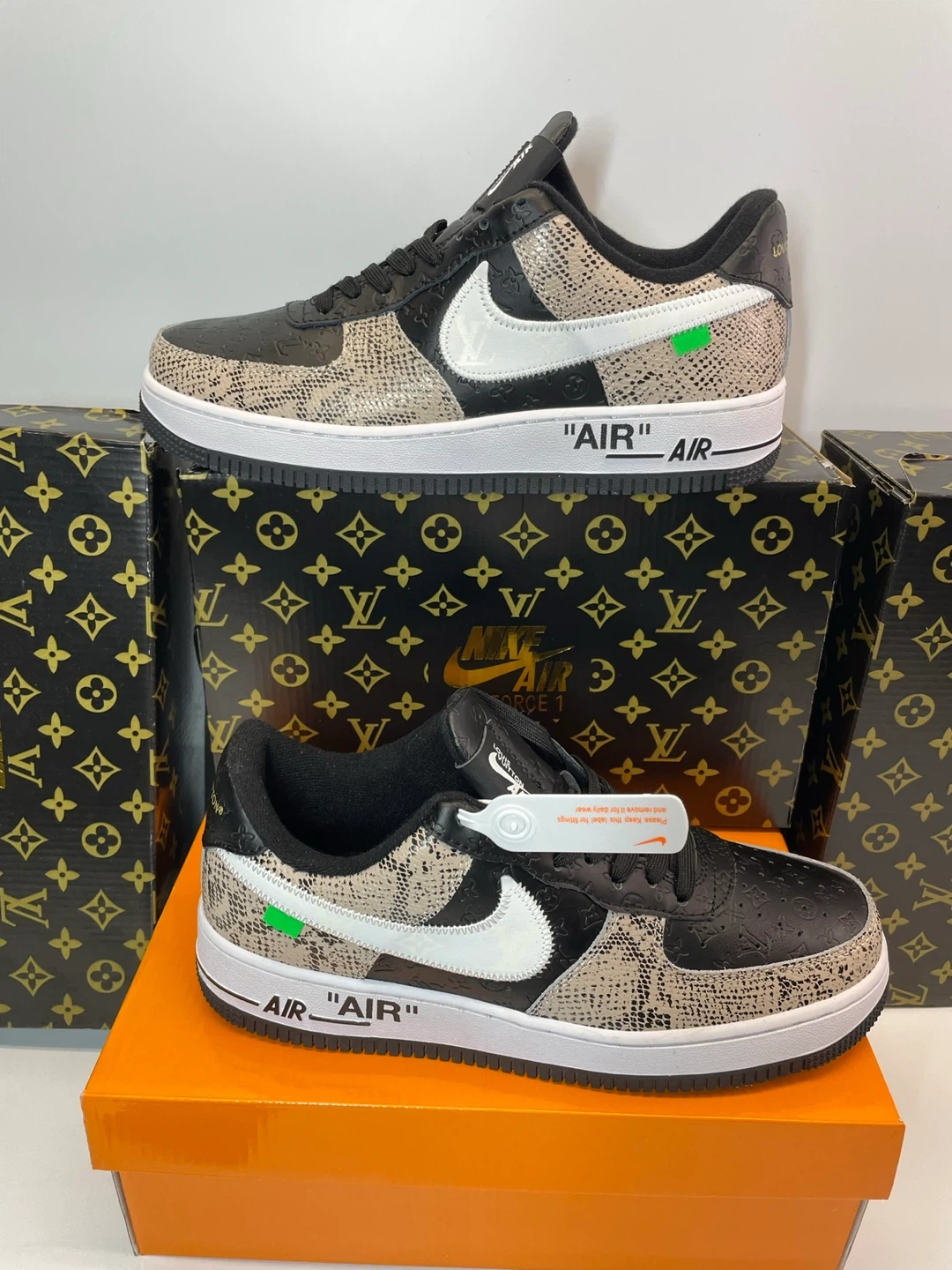 Custom Nike Air Force 1 sneakers featuring Louis Vuitton designs! These stylish shoes come with the box and are sure to turn heads