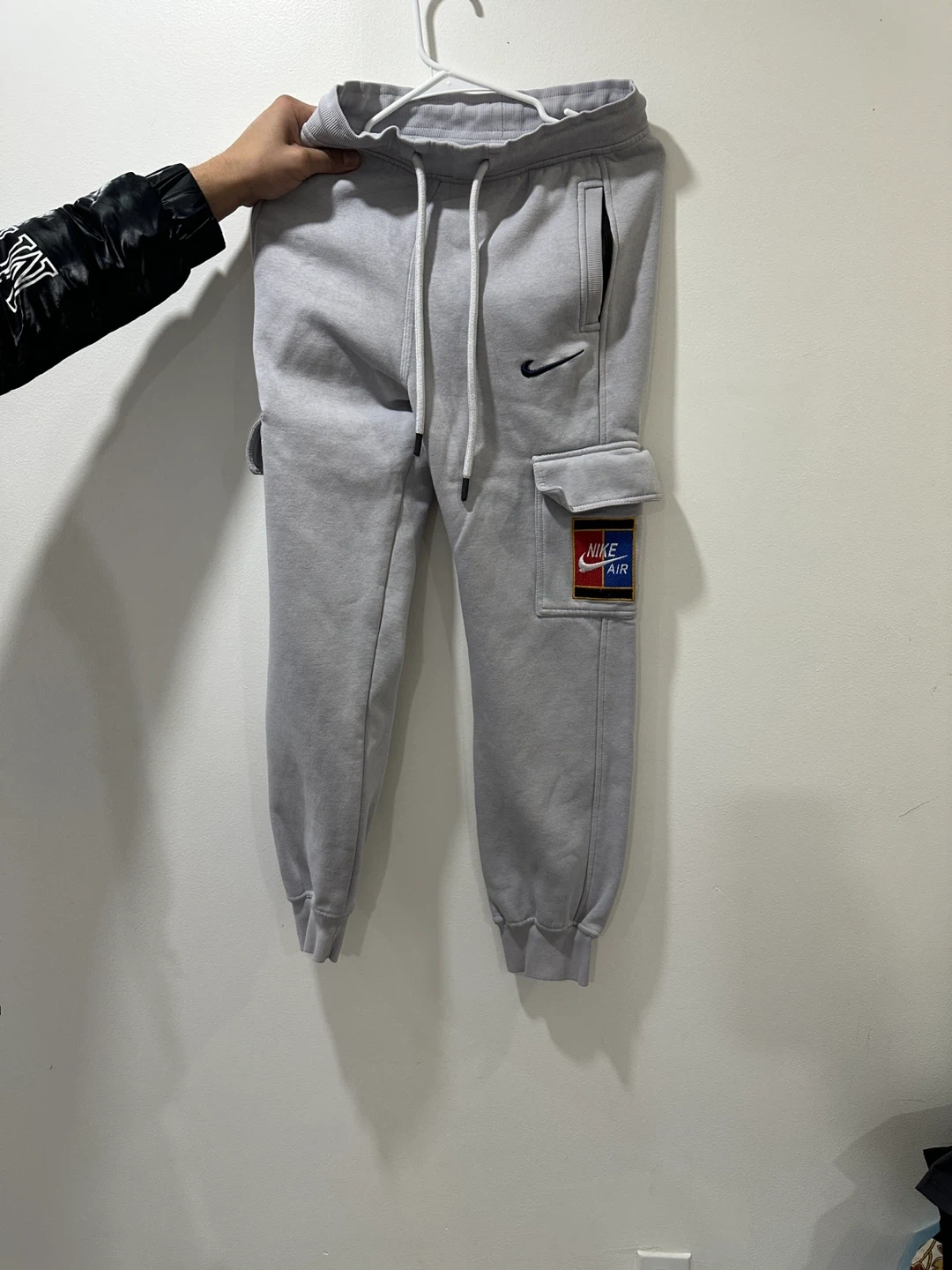 10Comfy grey Nike Air cargo sweatpants in great condition! Features a small black swoosh and a cool Nike Air patch on the pocket