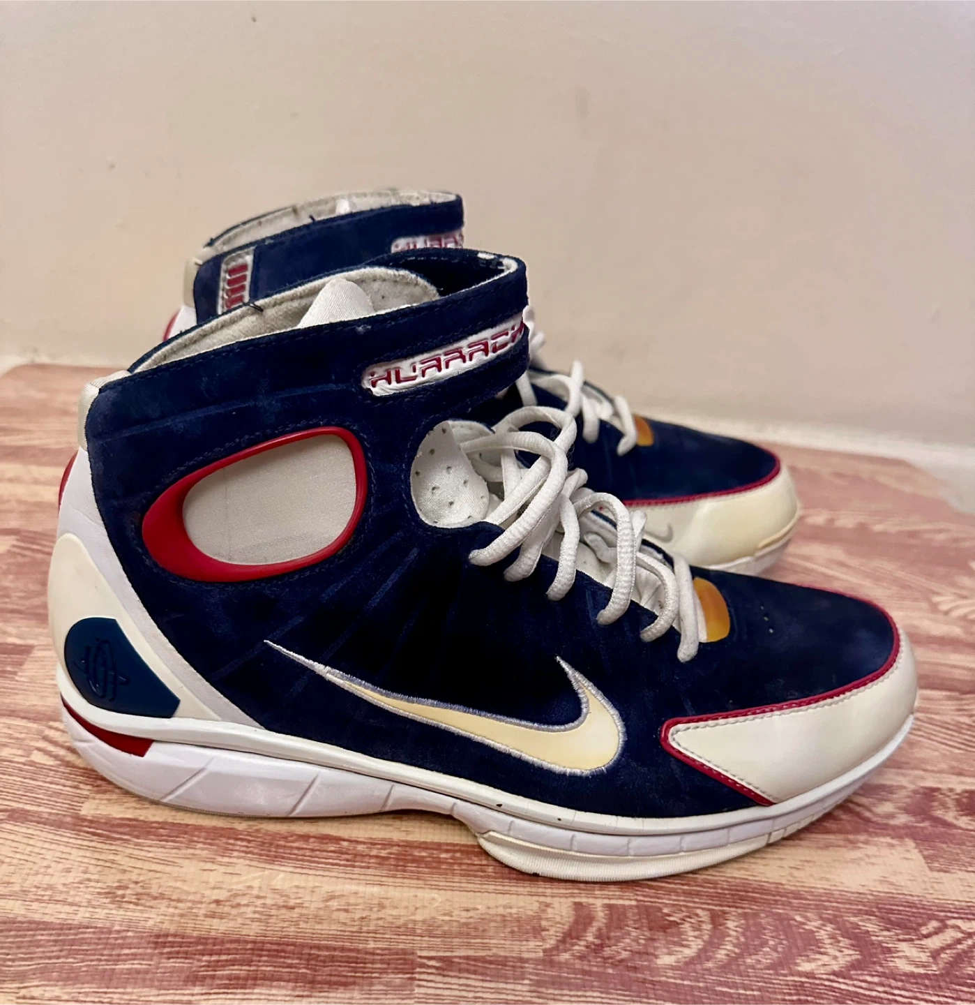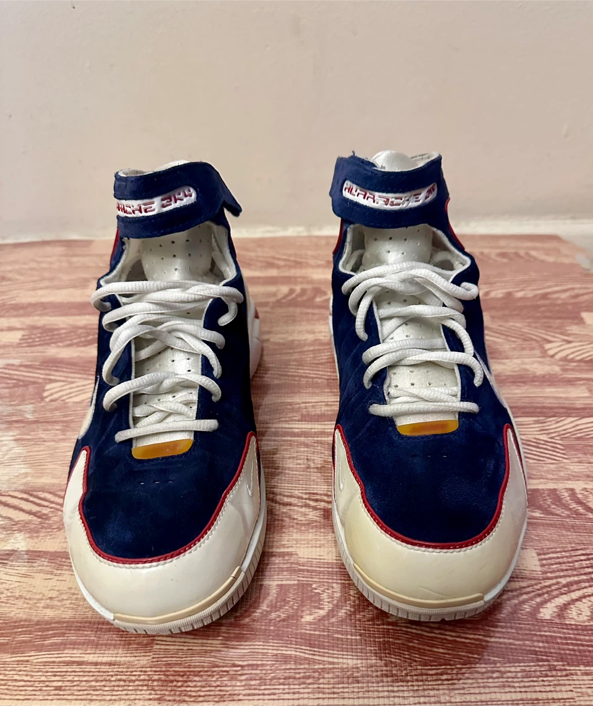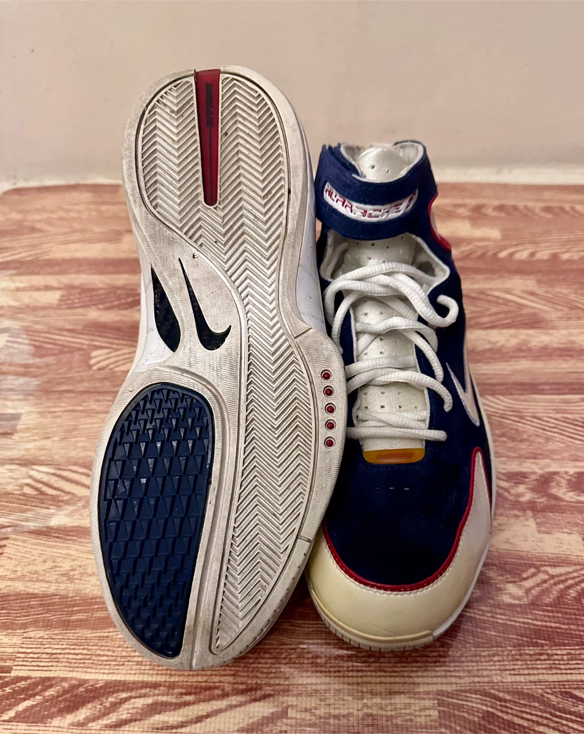 10Selling a pair of Nike Air Huarache basketball shoes. These are in good condition and ready for the court or casual wear. The shoes feature a navy blue, white, and red colour scheme with the iconic Nike swoosh. A stylish and functional addition to your footwear collection!