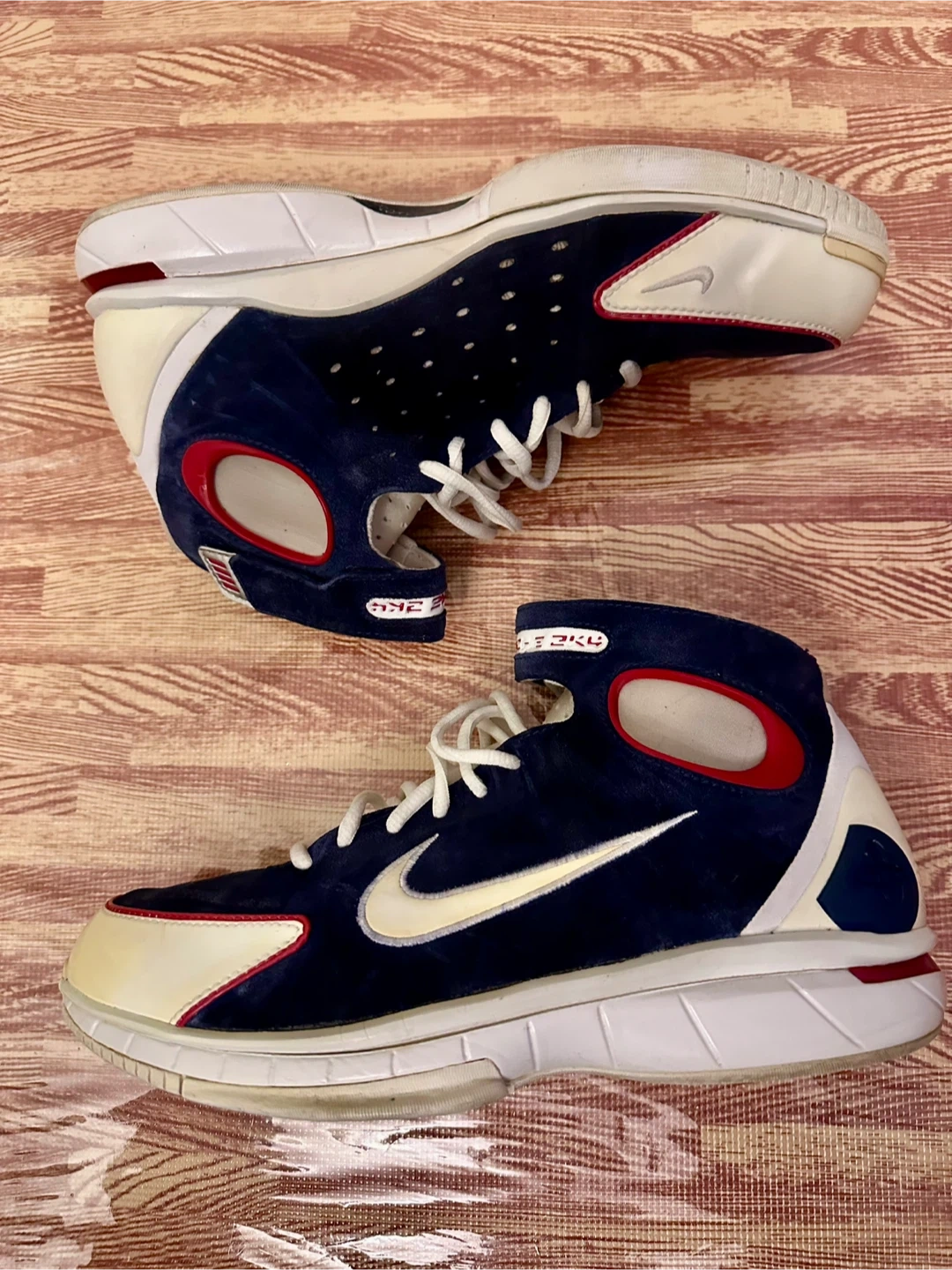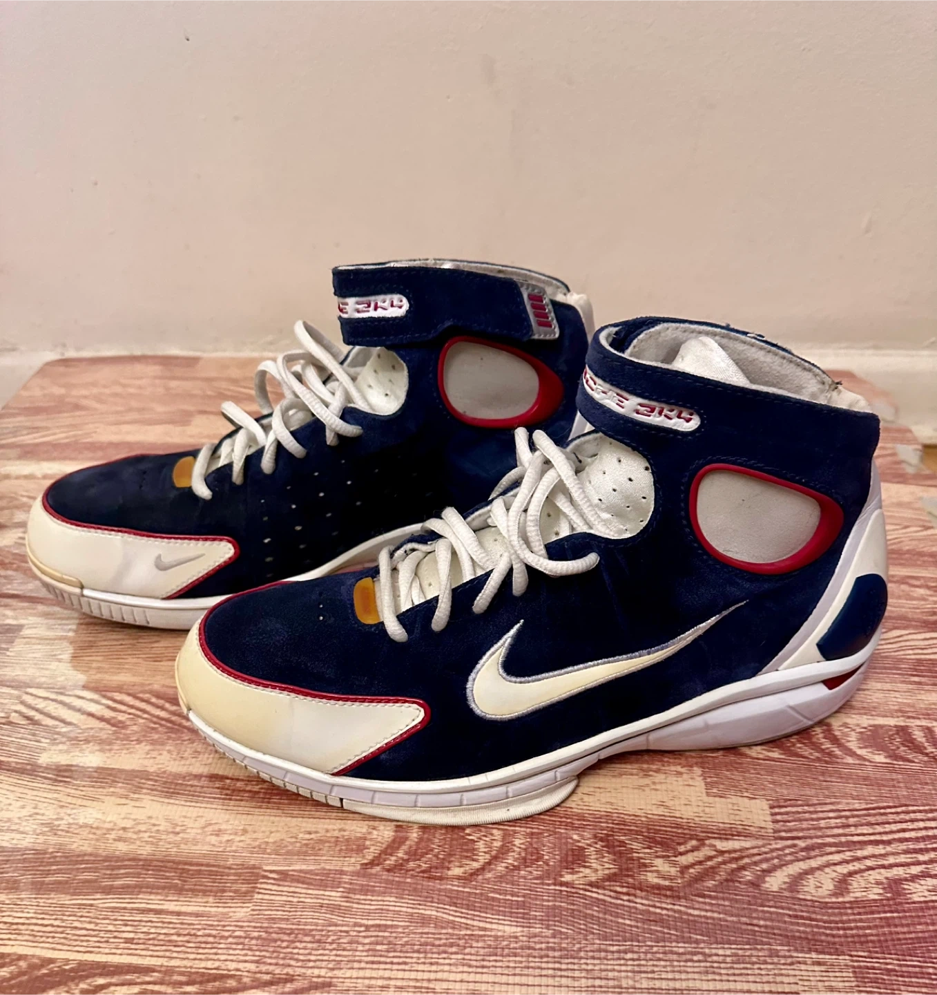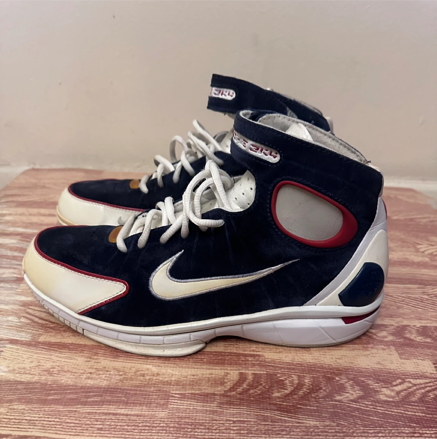 10Selling a pair of Nike Air Huarache basketball shoes. These are in good condition and ready for the court or casual wear. The shoes feature a navy blue, white, and red colour scheme with the iconic Nike swoosh. A stylish and functional addition to your footwear collection!