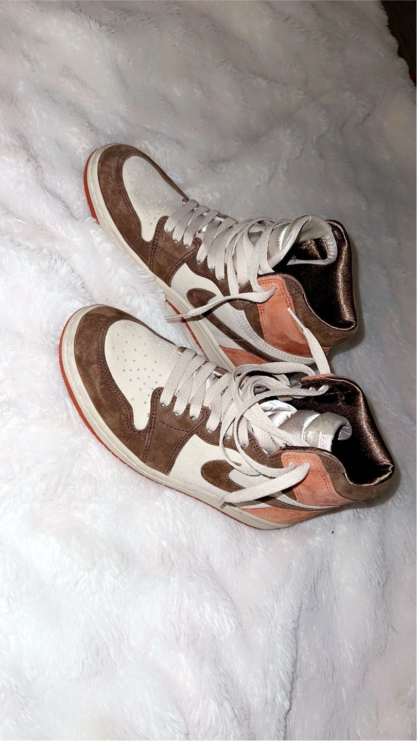 12Selling a pair of Nike Air Jordan 1 High sneakers. These are a stylish and iconic pair of shoes, brown and pink, barely worn only wore for a concert. Reg price 200