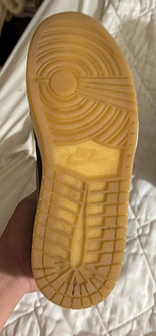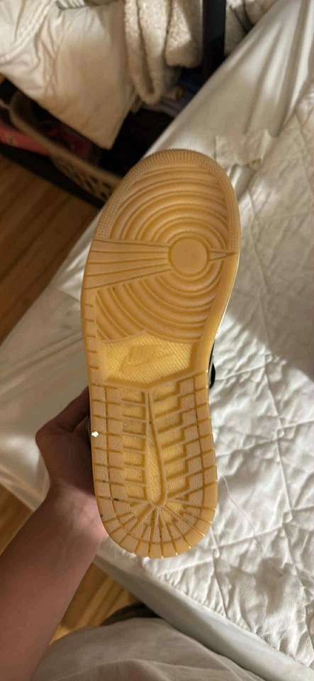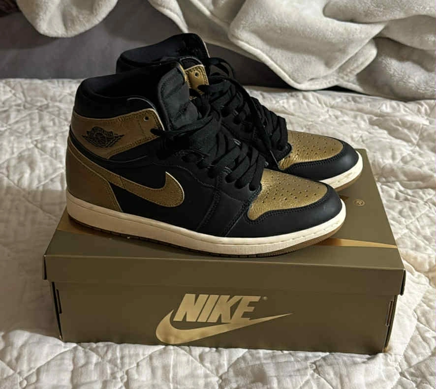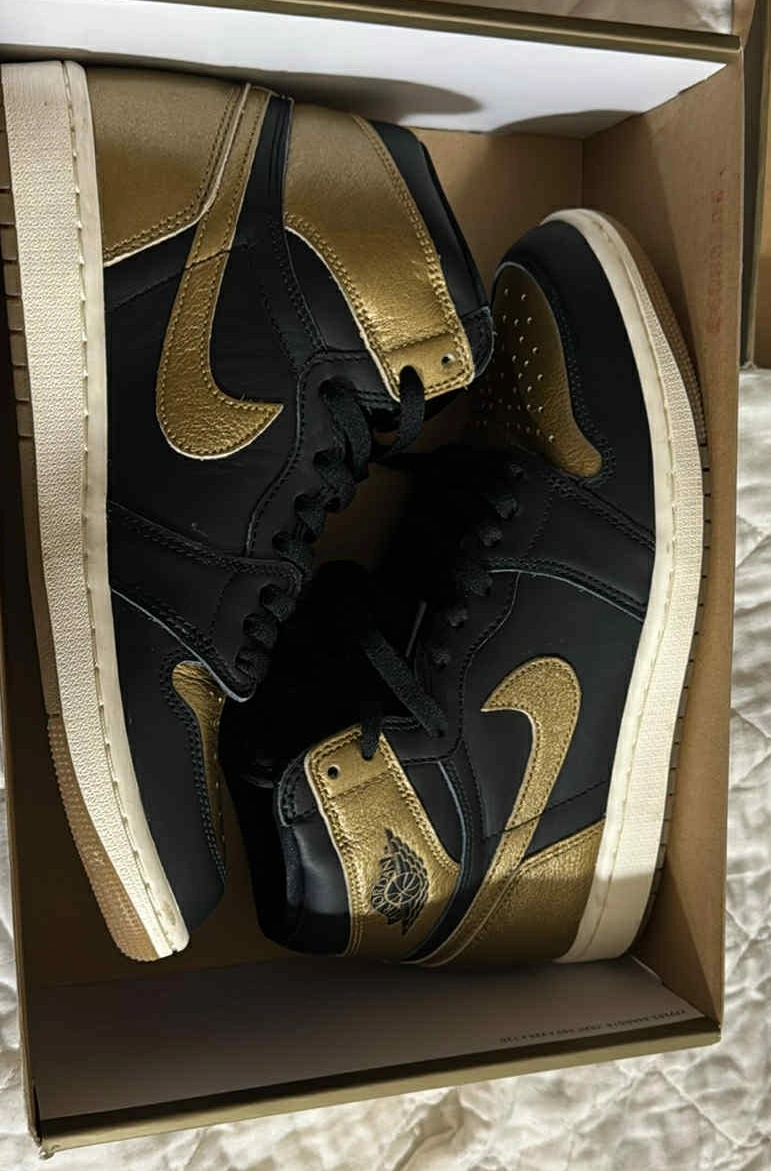Selling a pair of Nike Air Jordan 1 High OG in black and gold. They are in great condition and come with the original box. Perfect for any sneakerhead! my son wear it once and been sitting since
