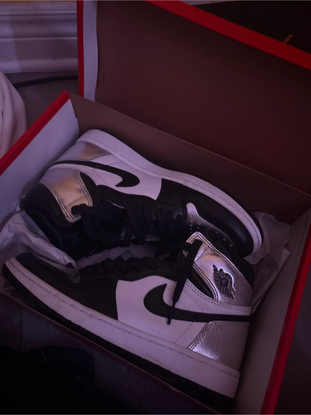 Selling a pair of Nike Air Jordan 1 High OG sneakers in black and metallic silver! They are a women's size 7.5 US. Comes with the original box. Worn once and come with the original laces too!