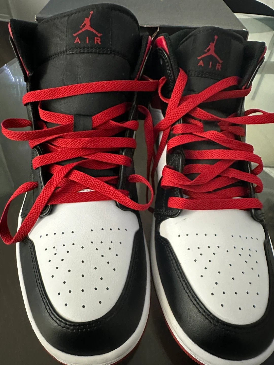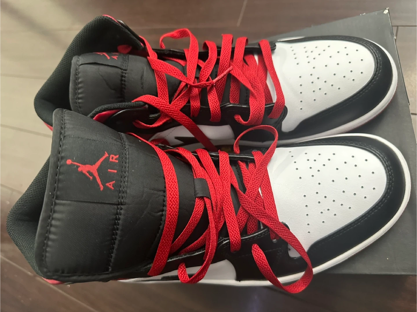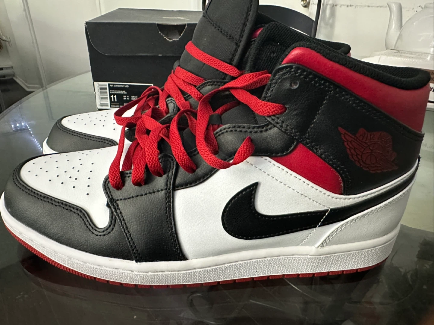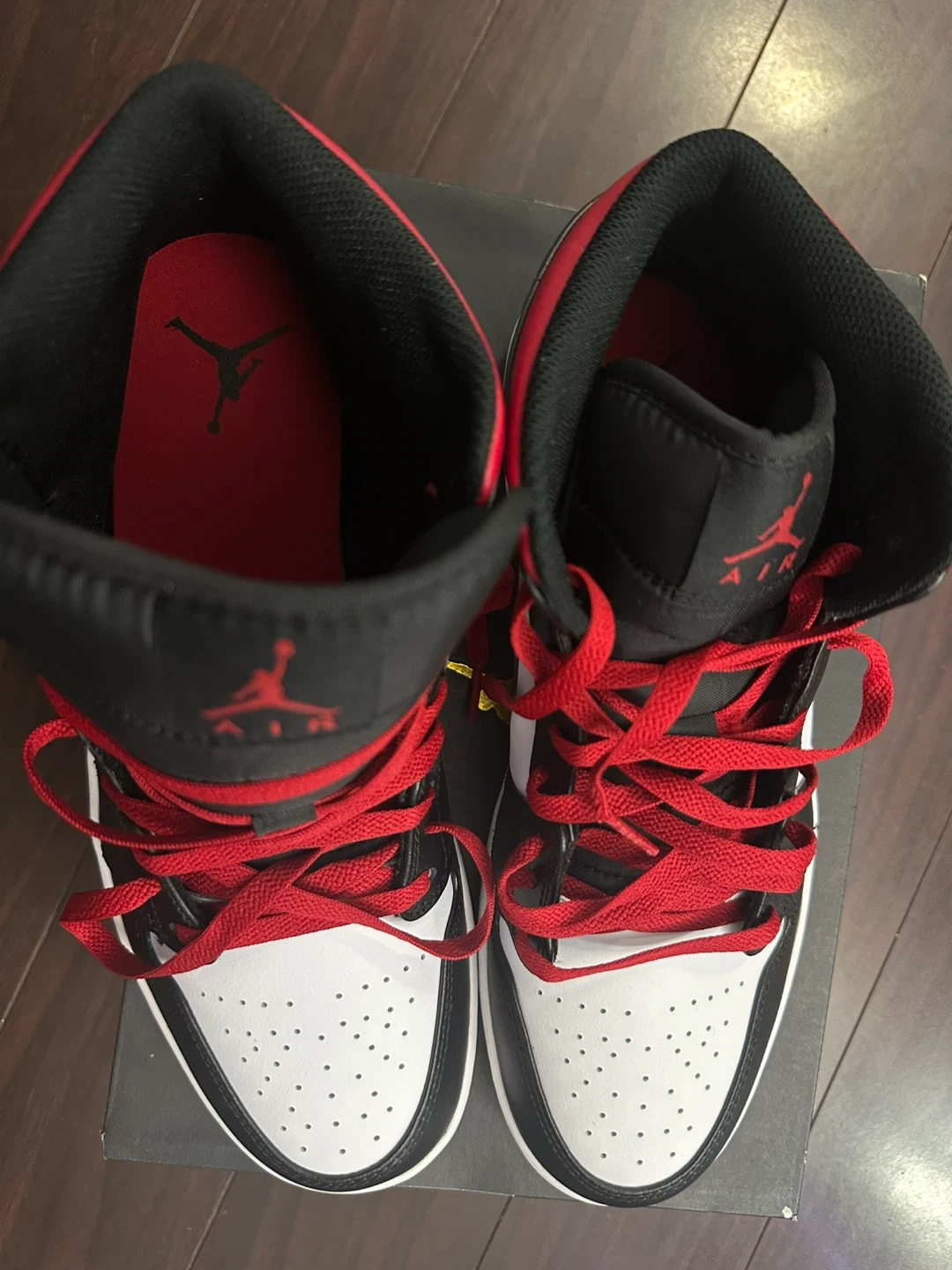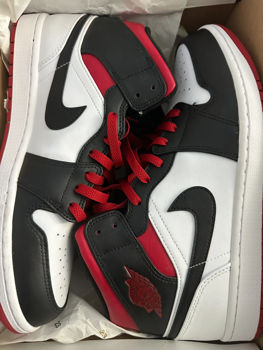 25Nike Air Jordan 1 Mid โ Black/White/Red (Brand New in Box) ๐ Product Details: Brand: Nike Air Jordan Model: Air Jordan 1 Mid Colorway: Black / White / University Red Design Features: Premium leather upper with a classic black and white base Striking red overlays and laces for a bold finish Iconic Jumpman logo embroidered on the tongue Perforated toe box for breathability Padded collar and durable rubber outsole for comfort and support Condition: Brand new, never worn Packaging: Comes with original box Size: 11 Perfect for casual wear, collecting, or basketball