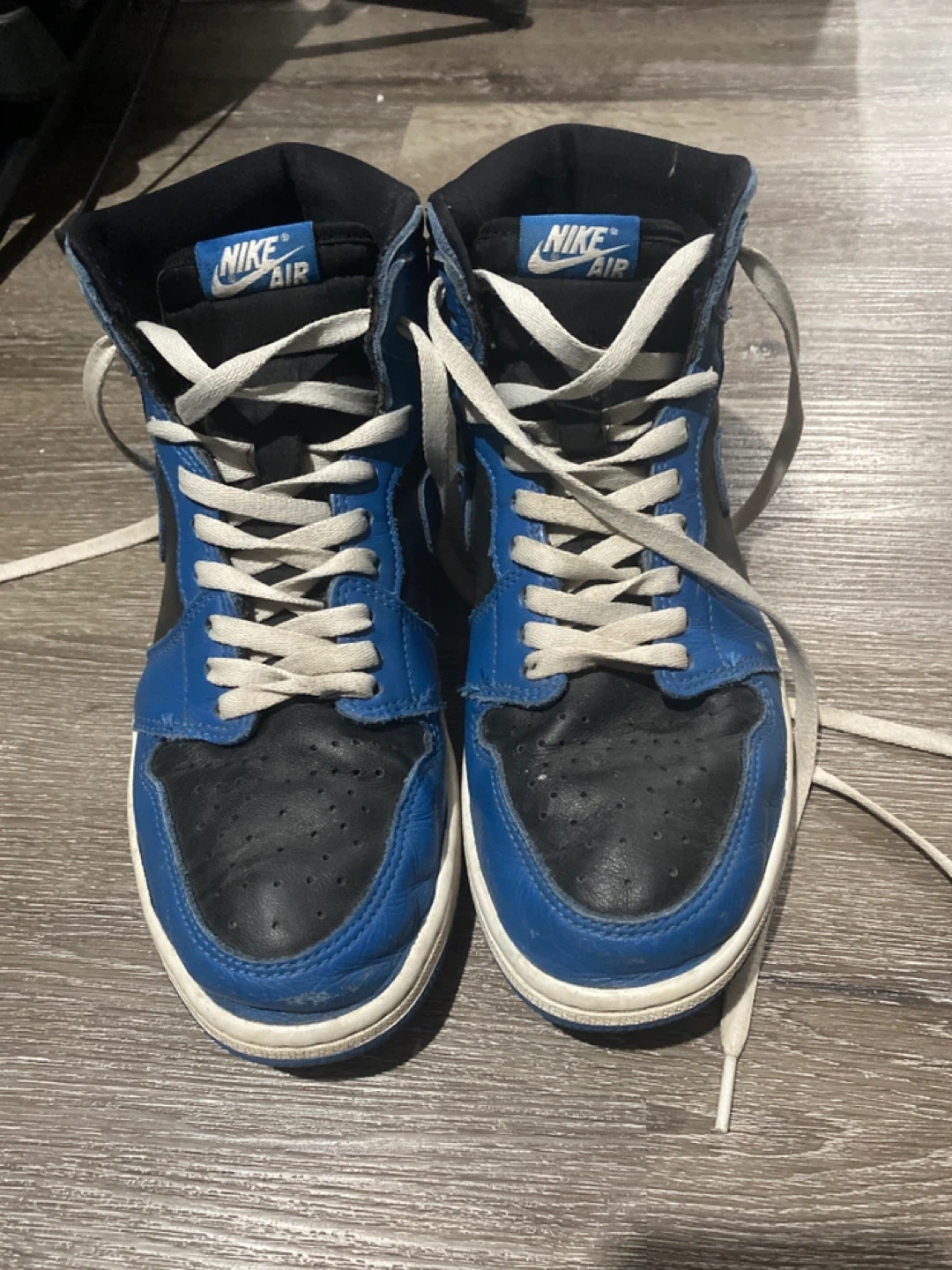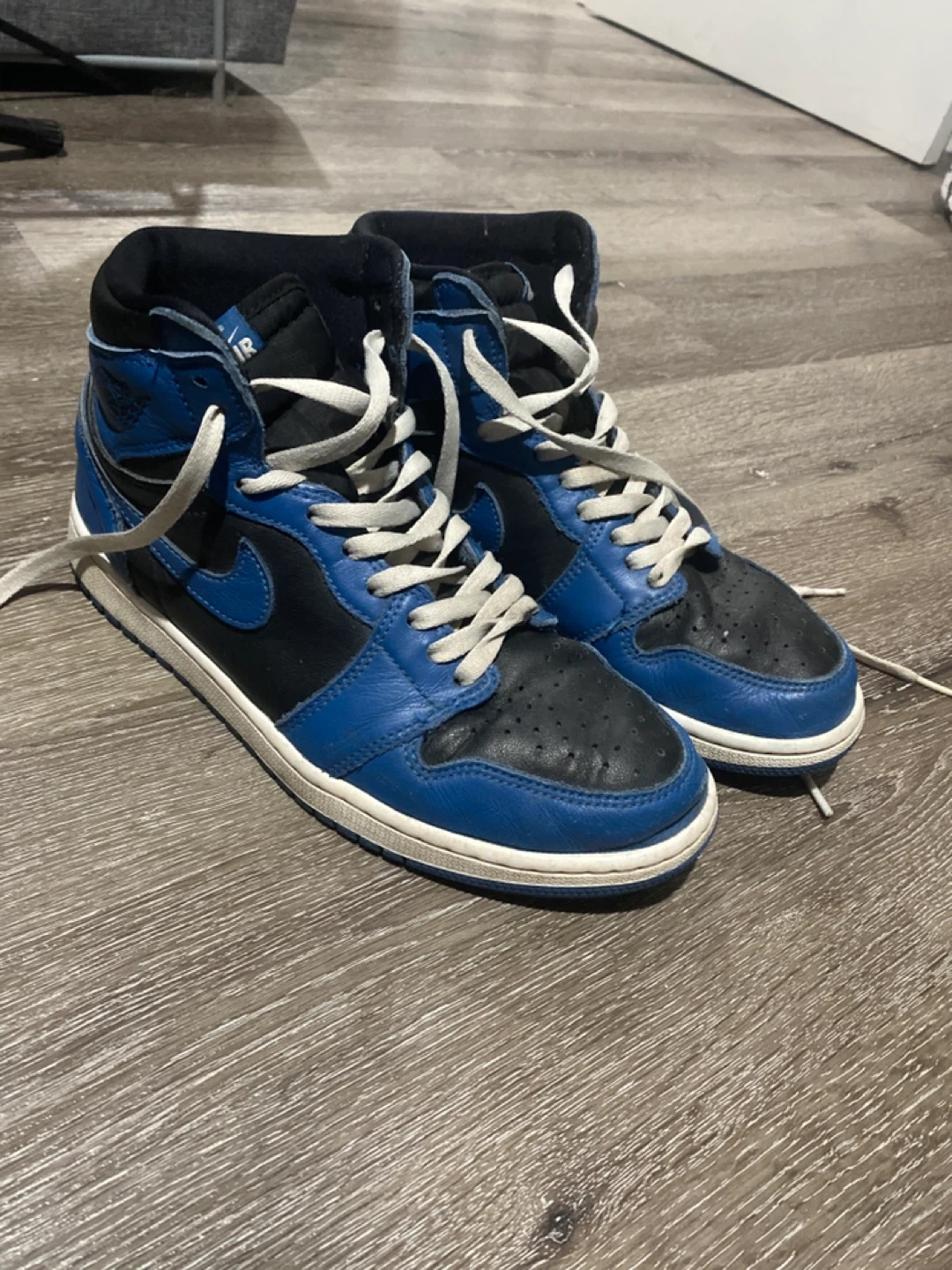 Selling a pair of Nike Air Jordan 1 Retro High sneakers in blue and black. They show some signs of wear but are still in good condition for everyday wear. Classic style!