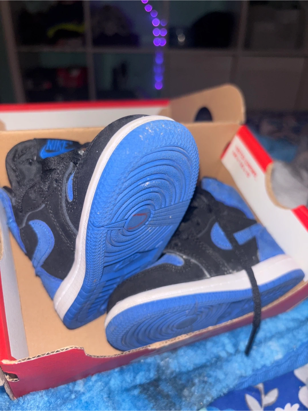 60Selling a pair of baby Nike Air Jordan 1 Retro High in a cool blue and black colourway! These shoes are in great condition and ready for a new home. Only have been worn once