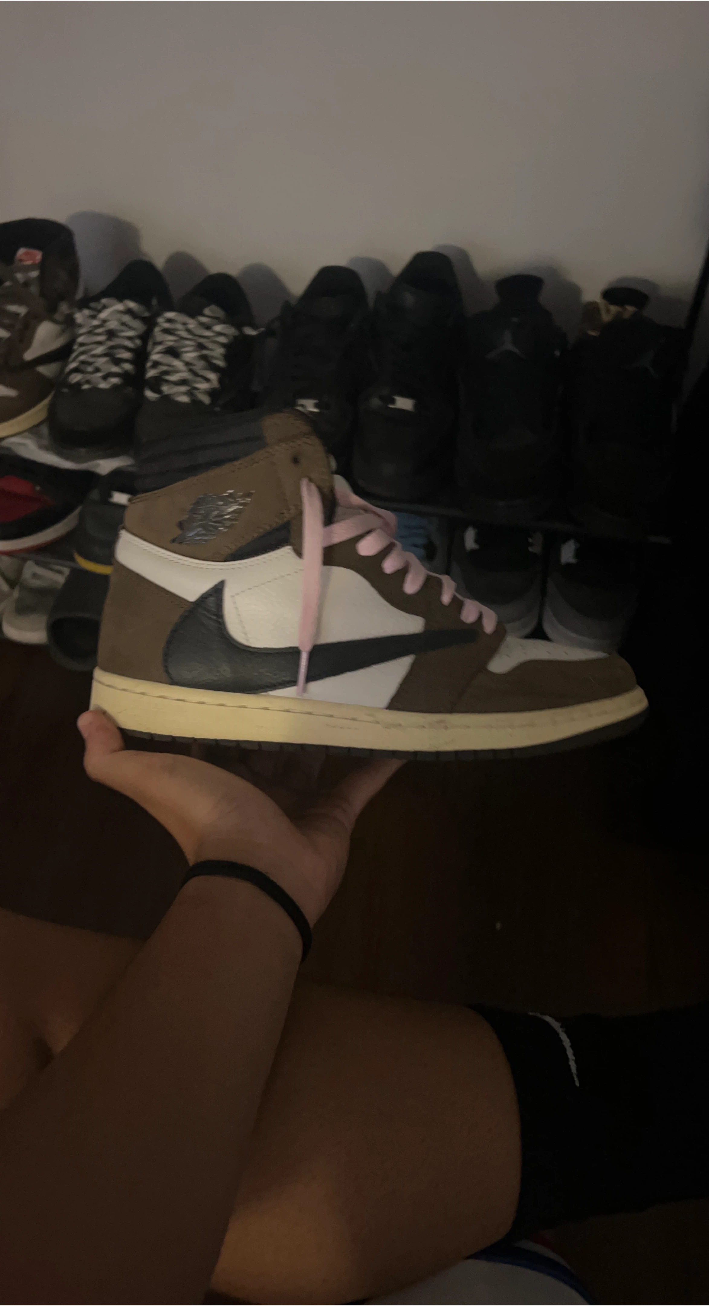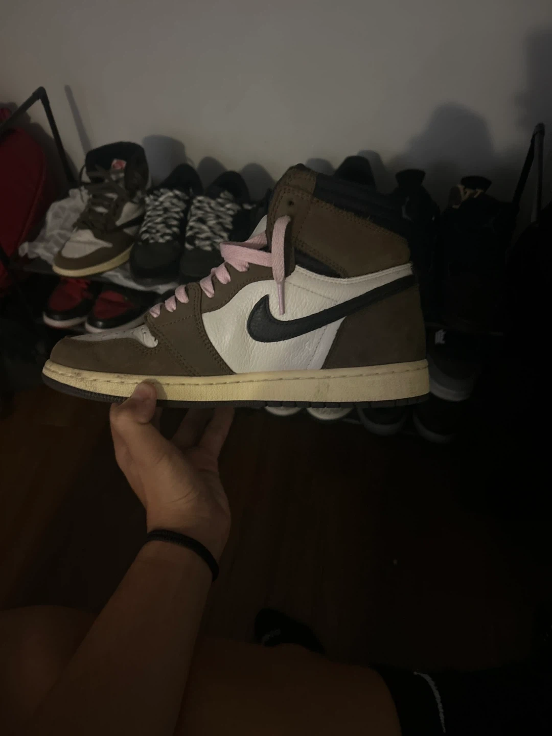 13Selling a pair of Nike Air Jordan 1 Travis Scott sneakers. They show some signs of wear, as you can see in the photos. The iconic design and quality make them a standout addition to any collection!