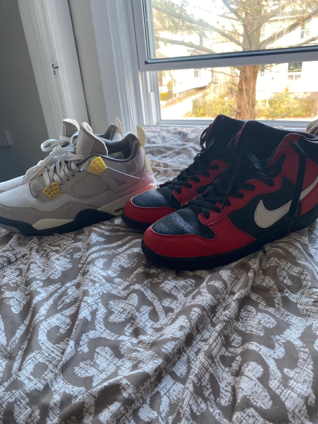 10Selling a pair of Nike shoes. One is the Air Jordan 4 Retro in a grey and yellow colourway, and the other is a Dunk High in black and red with a white swoosh. Both are in decent condition!