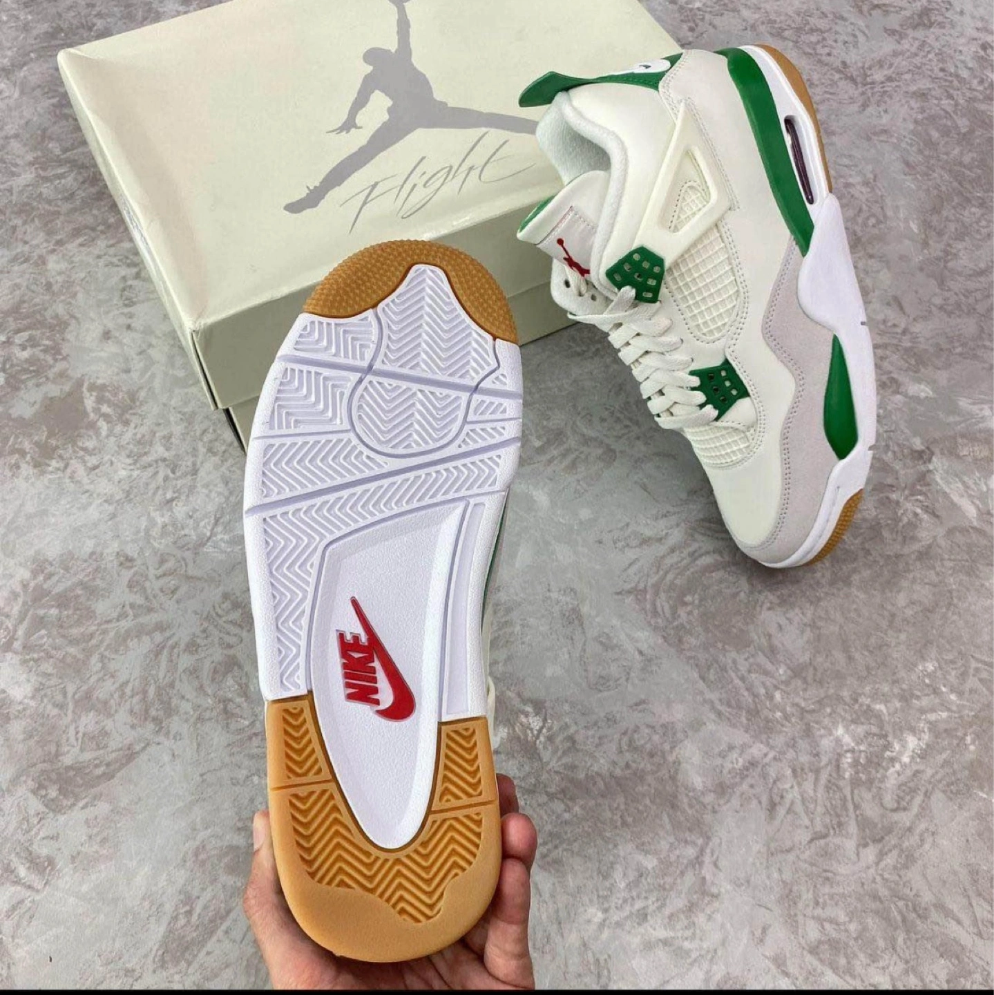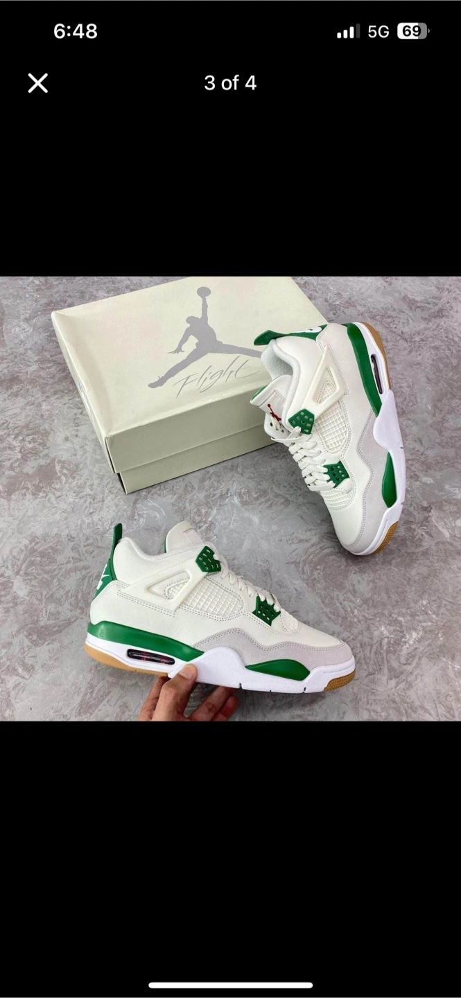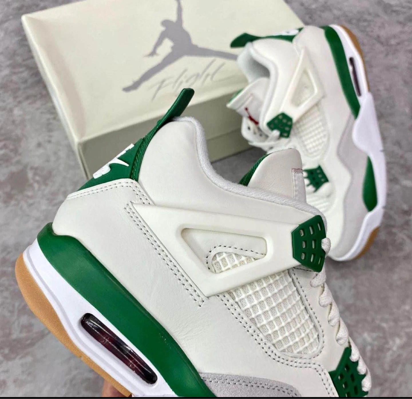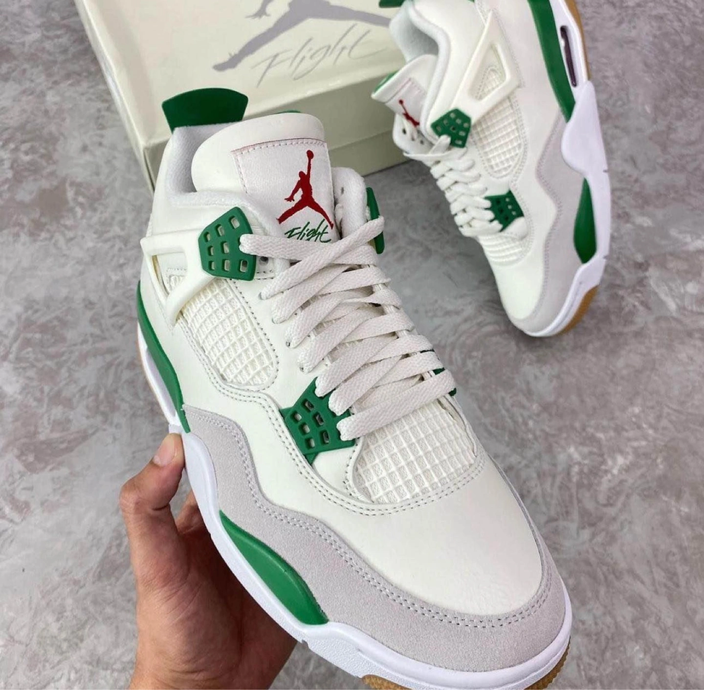 Selling a pair of Nike Air Jordan 4 Retro in a stylish green and white colourway. These sneakers are in great condition and come with the original box. Perfect for anyone looking to add a classic pair of Jordans to their collection!