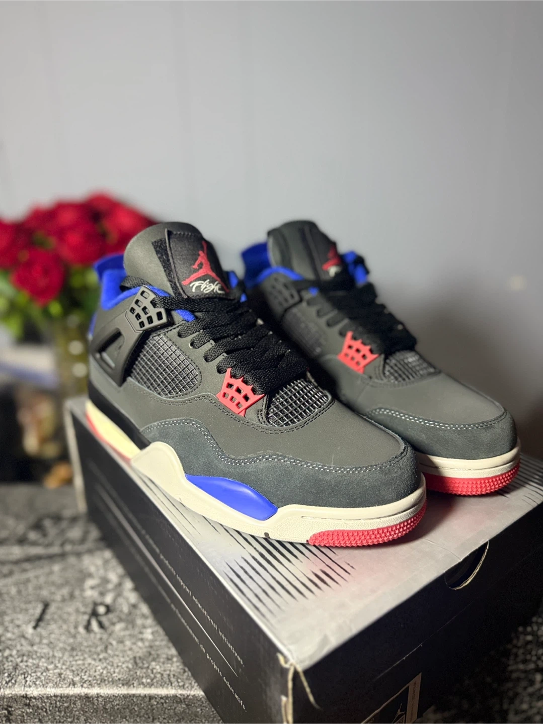 Selling a pair of Nike Air Jordan 4 Retro Rare Air sneakers! They are in great condition and come with the original box. The shoes feature a gray, black, blue, and red color scheme. Feel free to reach out if you have any questions!