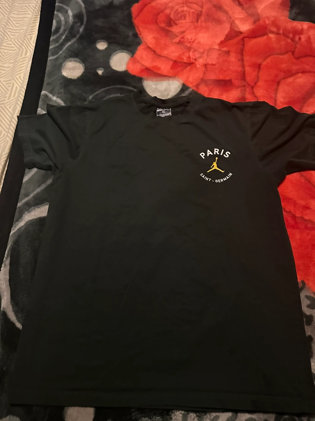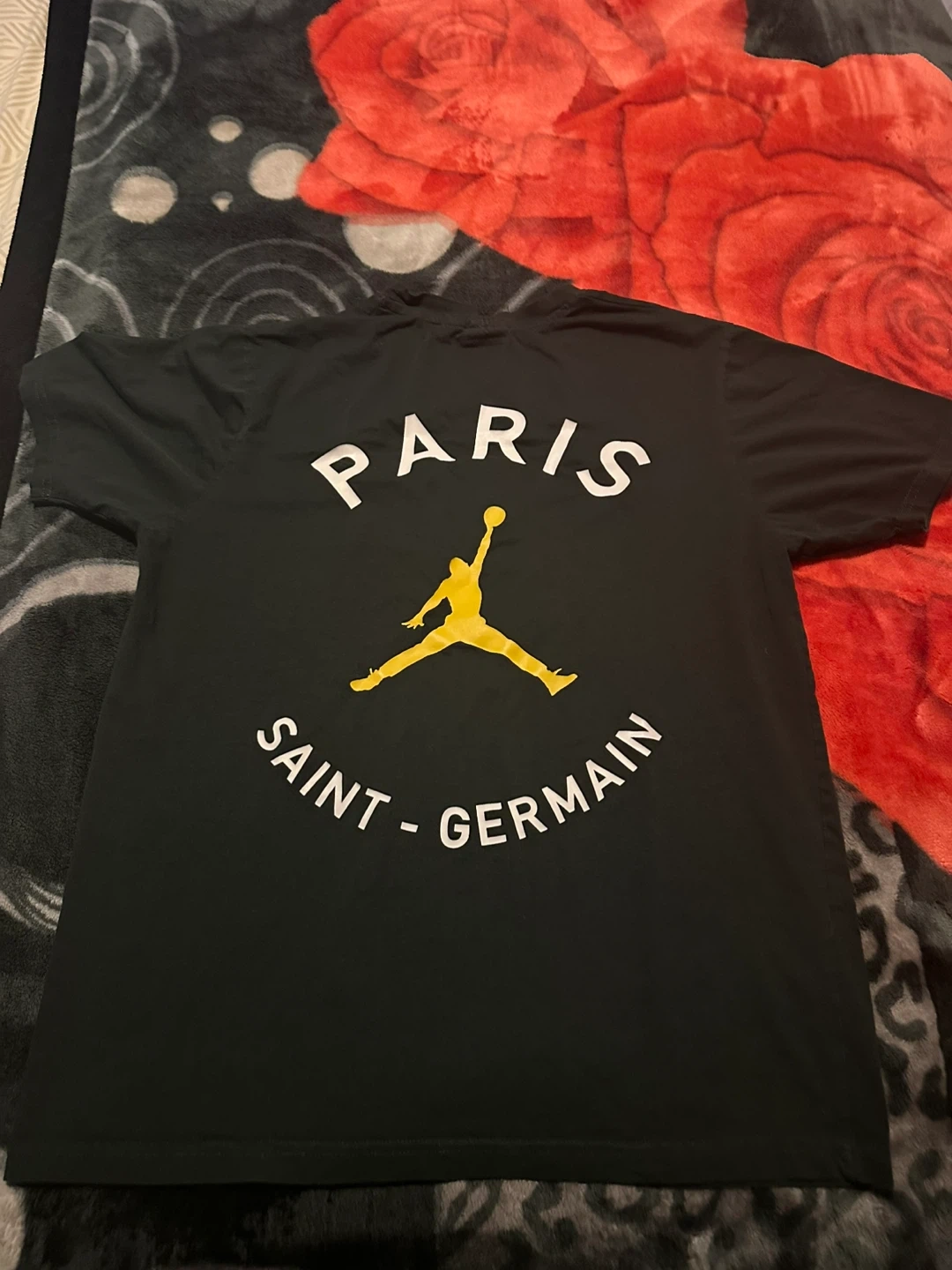 Selling a black Nike Air Jordan Paris Saint-Germain t-shirt! It features the iconic Jumpman logo with 'PARIS' and 'SAINT-GERMAIN' text. A stylish and comfortable tee for any fan!