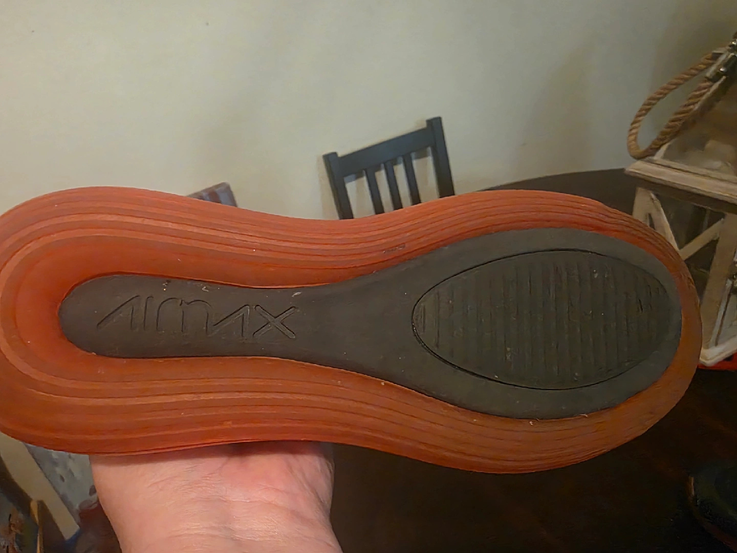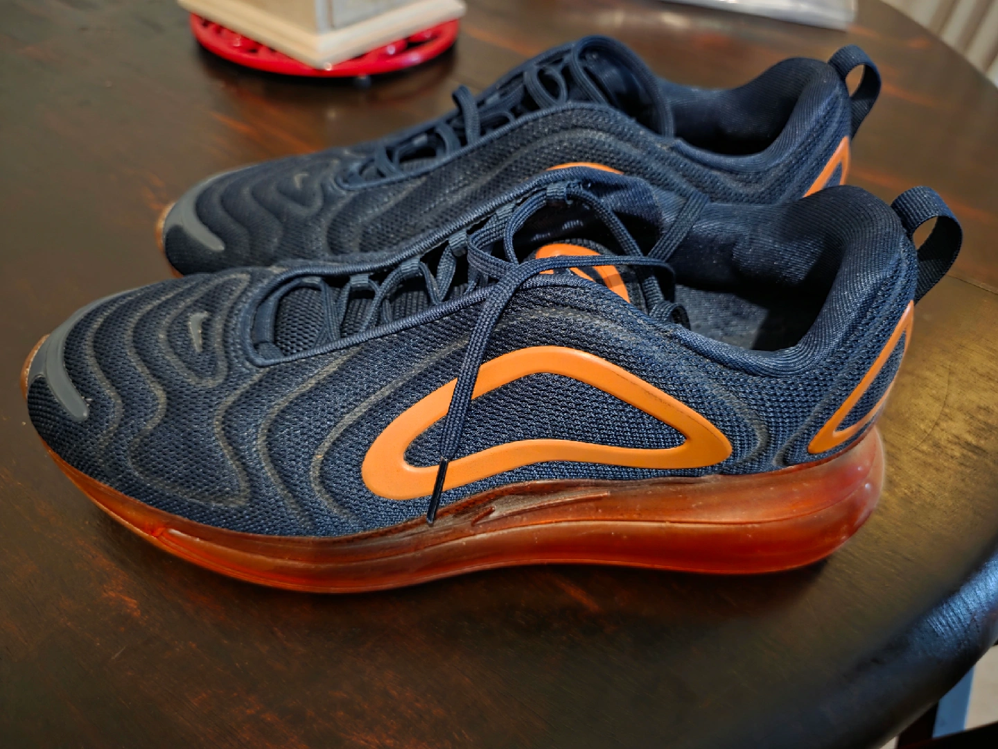 Selling a pair of Nike Air Max 720 sneakers in size 10. They are in good condition and have a unique design with a prominent Air Max sole. The colourway features a navy upper with orange accents. Perfect for adding a pop of style to your everyday look. Only worn a few times so the sole is like new.
