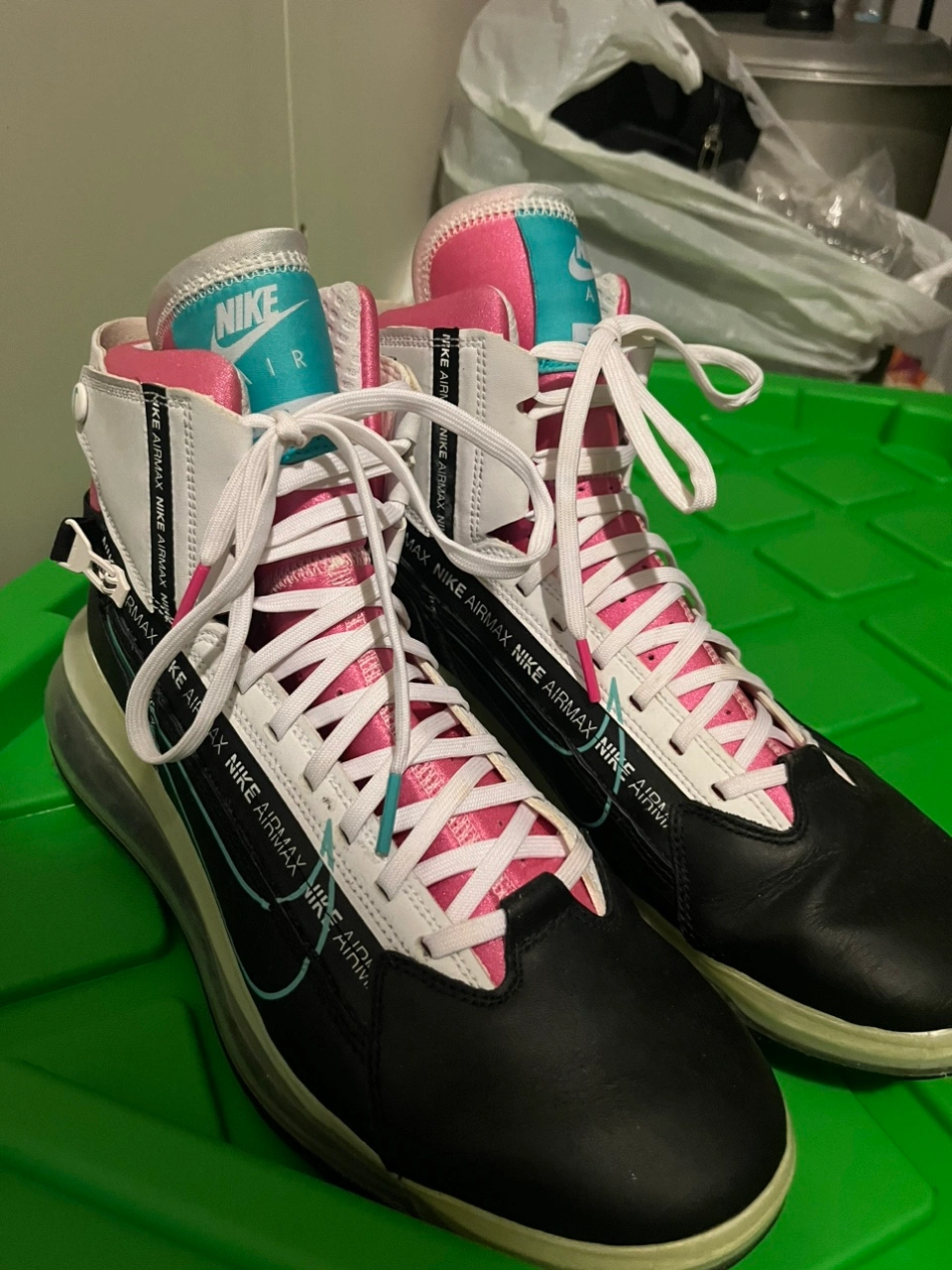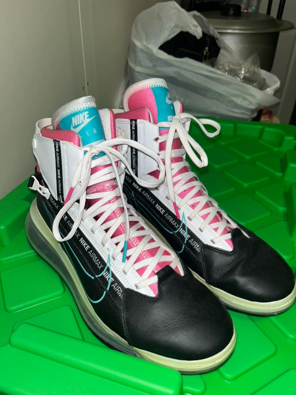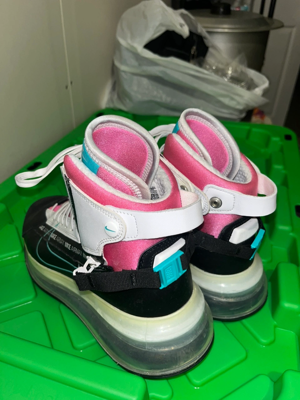 These are the Nike Air Max 720/95 shoes in the black, white, pink and teal colourway.