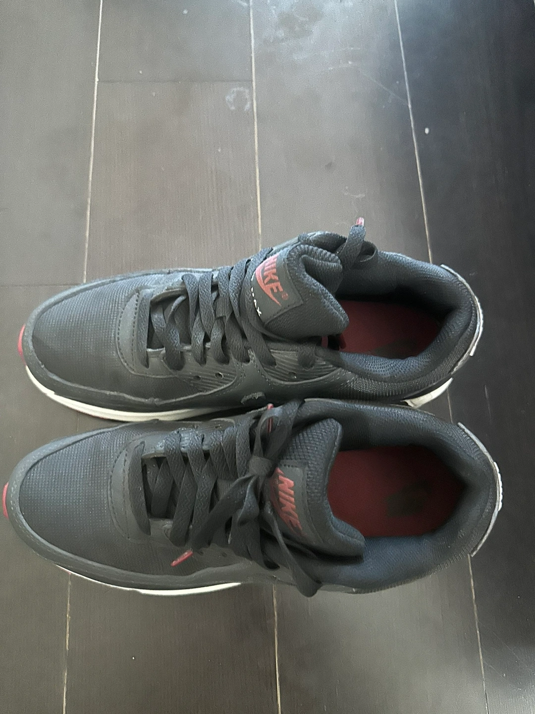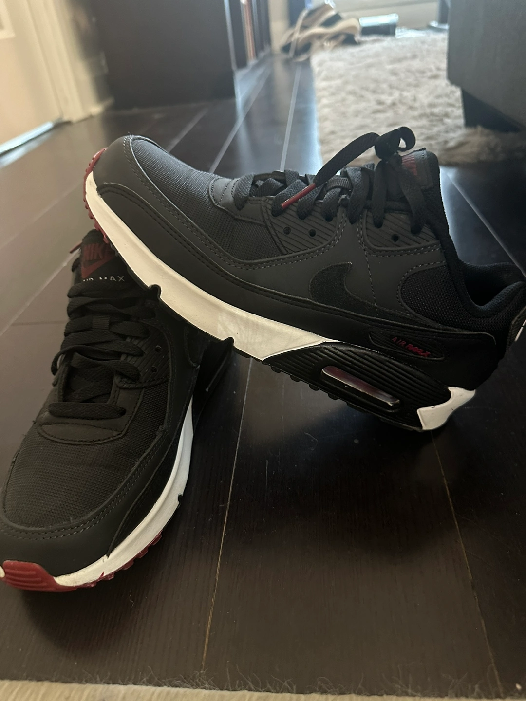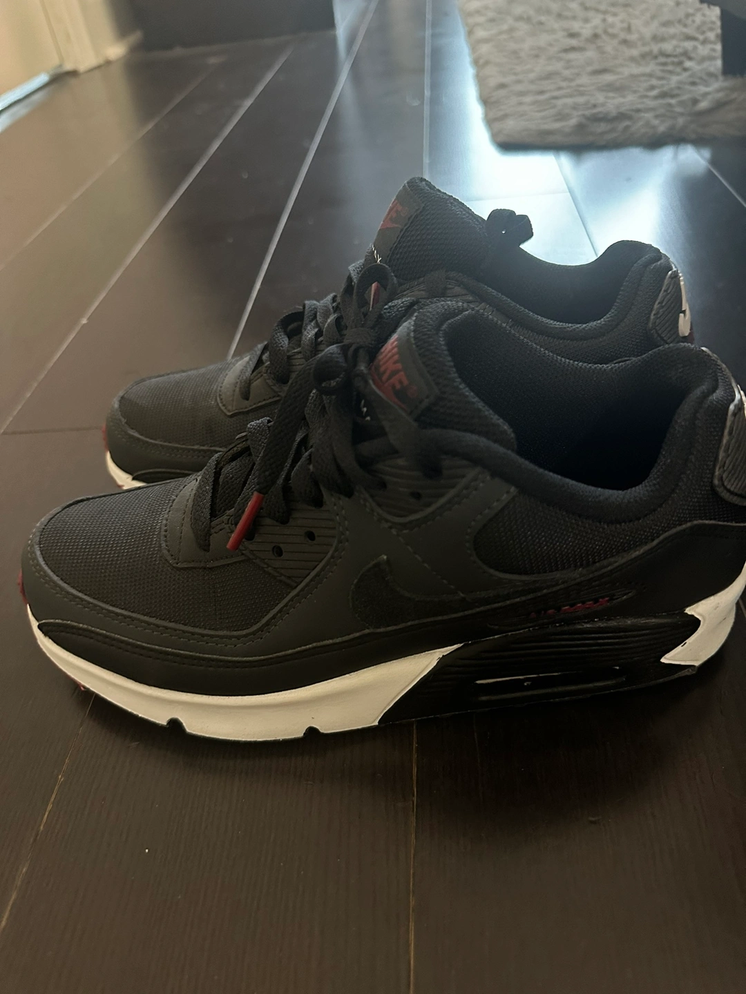 Black Nike Air Max 90 sneakers in good condition. These are size 6.5Y kids/ 8 women’s and feature black and red accents. Worn twice