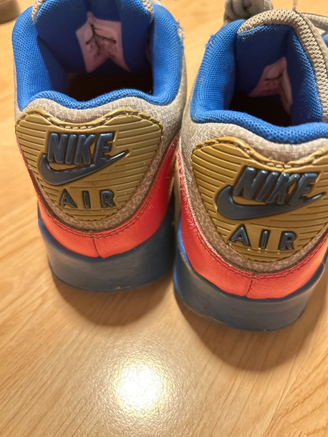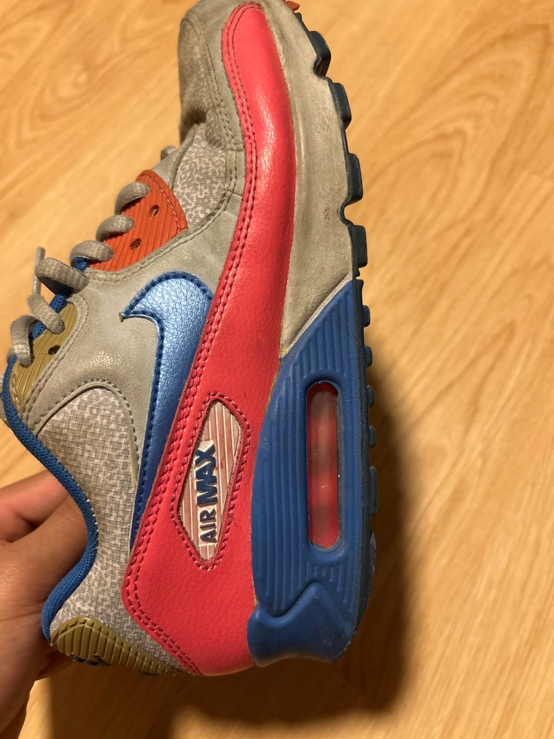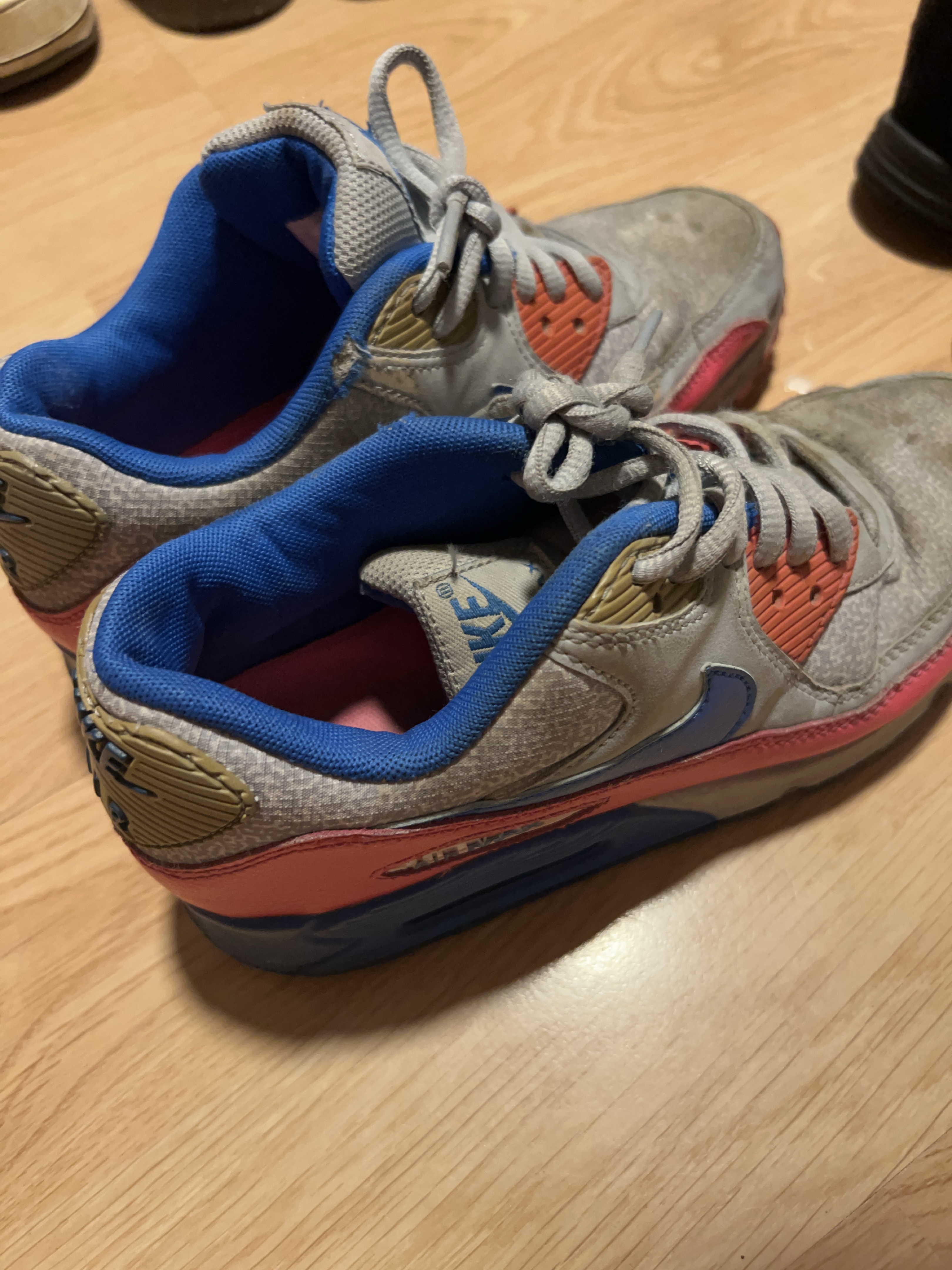Pre-owned Nike Air Max 90 shoes. Grey, pink, and blue colour scheme. Show some wear. Good for everyday use.