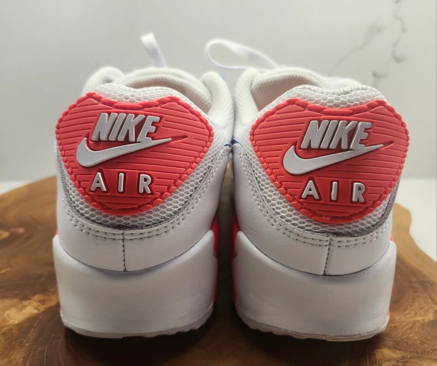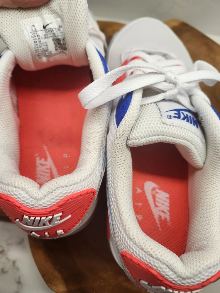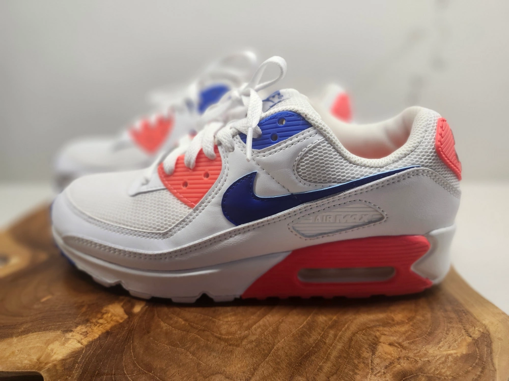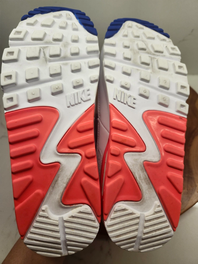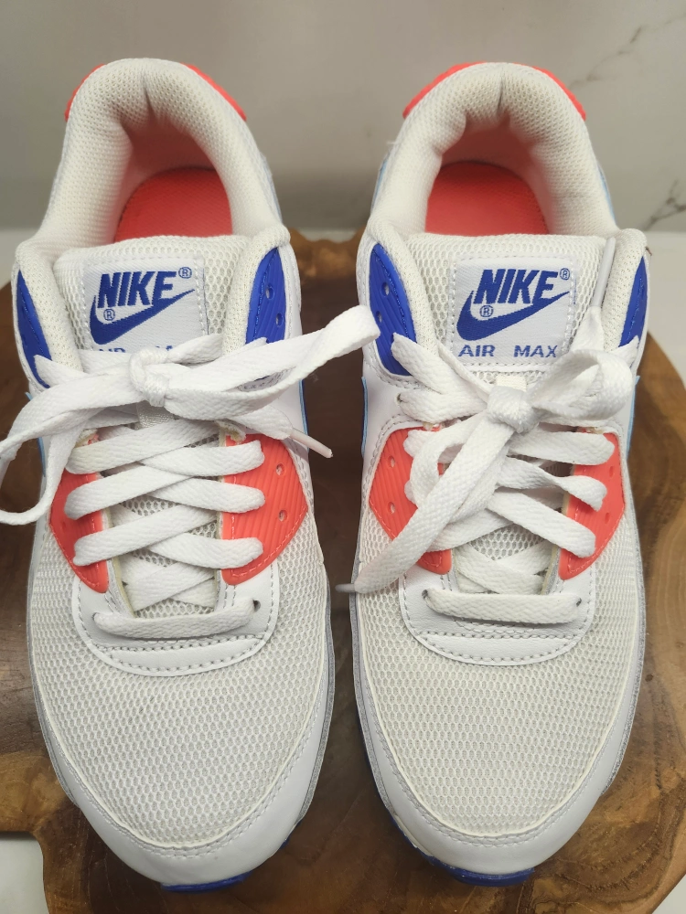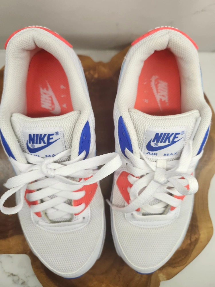 Pre-owned Nike Air Max 90 running shoes. White leather and mesh upper. Blue and coral accents. Visible Air Max cushioning. Great for everyday wear or workouts. Note: Please refer to images for condition.