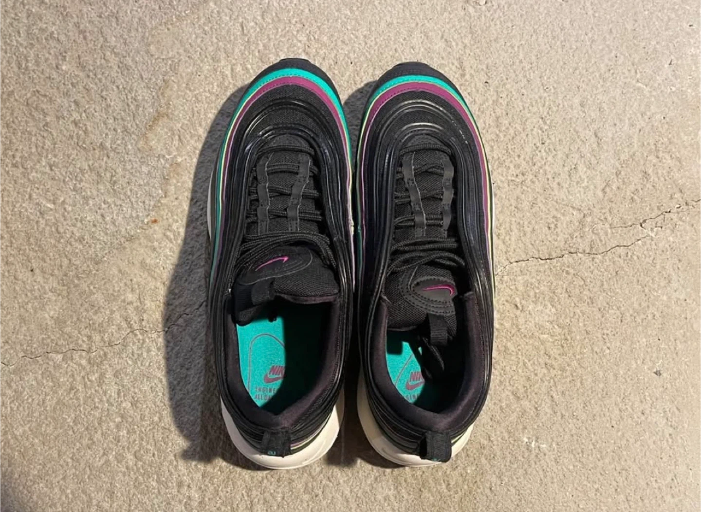 Selling a pair of Nike Air Max 97 sneakers in a sleek black and purple colourway. They are a US size 9.5. The shoes are in good condition and ready for a new home!